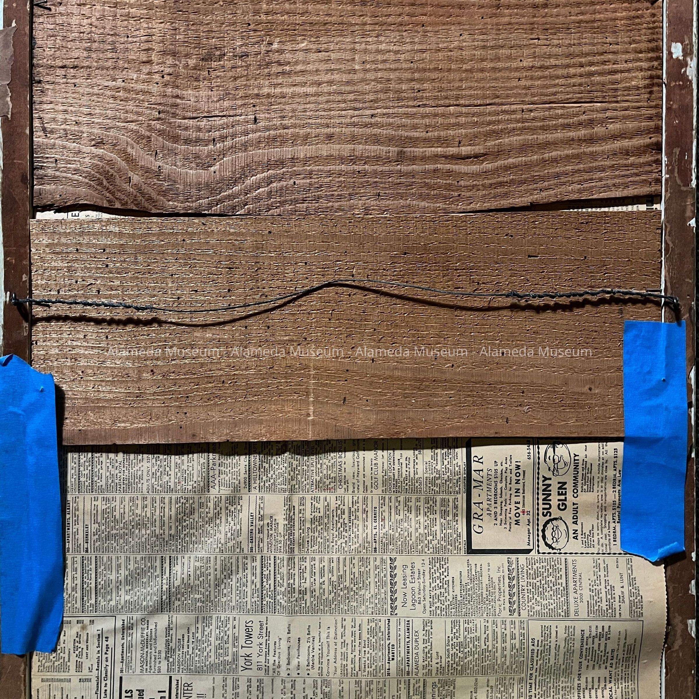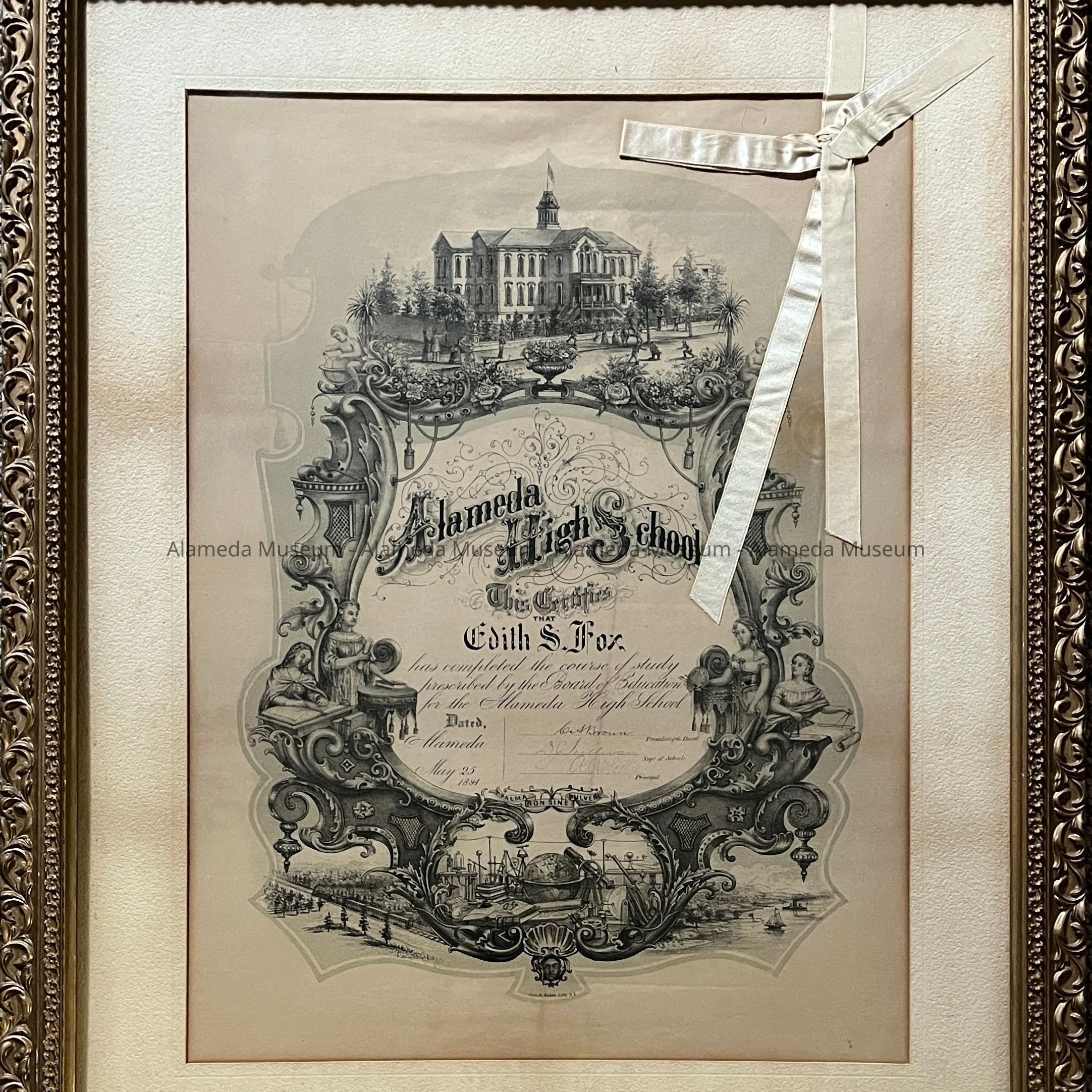Description: Lithographic certificate with bold printed caption "Alameda High School" with by hand in ink in Gothic letters: Edith S. Fox. Further information blanks inscribed in ink, by hand. Images include a thee-story building with cupola, a steam train, view of a shoreline with schooner and steamship, and women dressed in classical or medieval dress, involved in oratory, writing, holding both a painter’s palette and a harp, and cartography. Document is matted, behind glass, and in original gold-painted wood and gesso frame, with backing partially with thin wood planks with evidence of woodworm, and partially only newspaper. An off-white silk ribbon is also behind the glass.