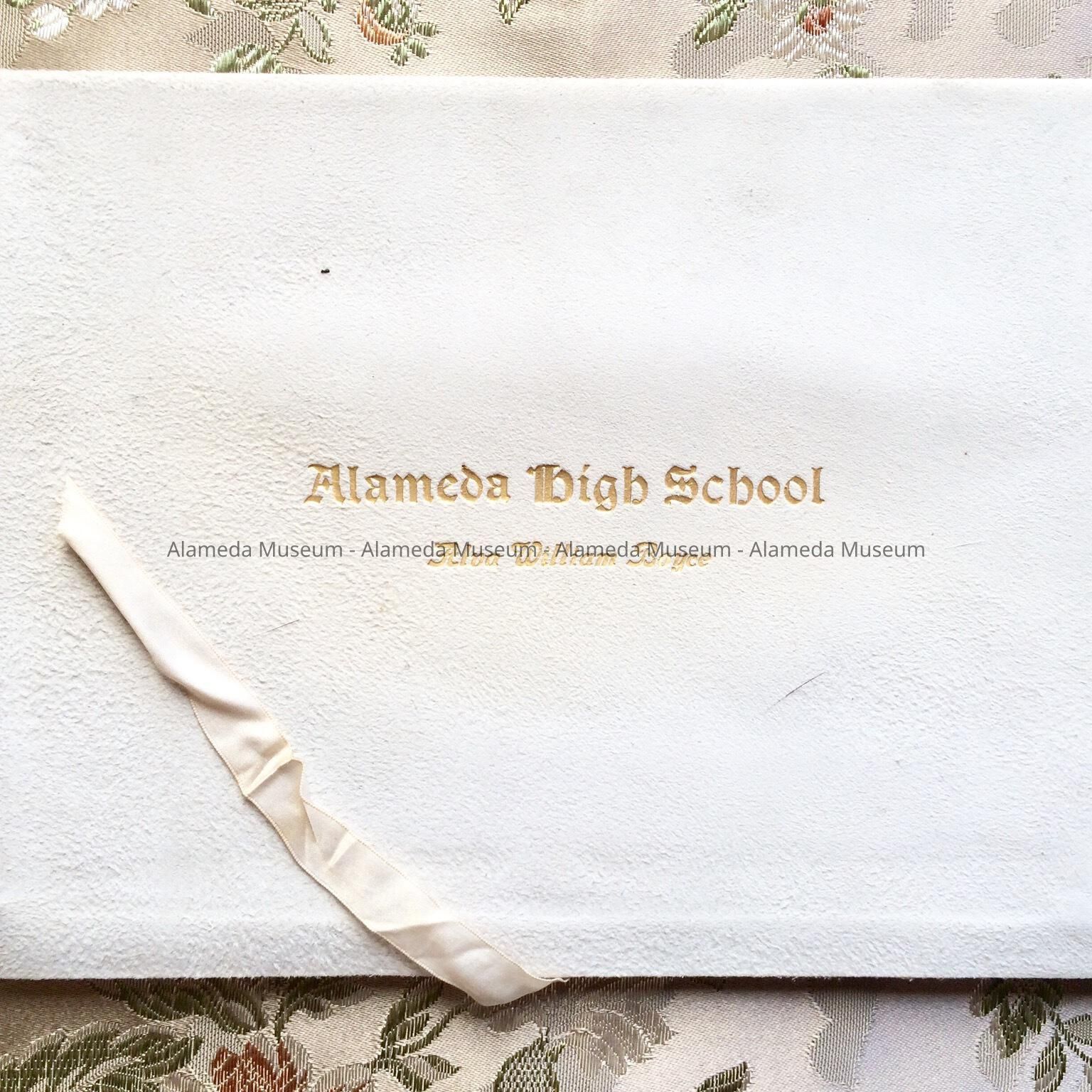 Description: Diploma printed on imitation parchment paper with elaborate type, enclosed in a silk lined kid leather (white) cover (or case). Incised gold lettering on cover "Alameda High School," & name Alva William Boyce (recipient of diploma).