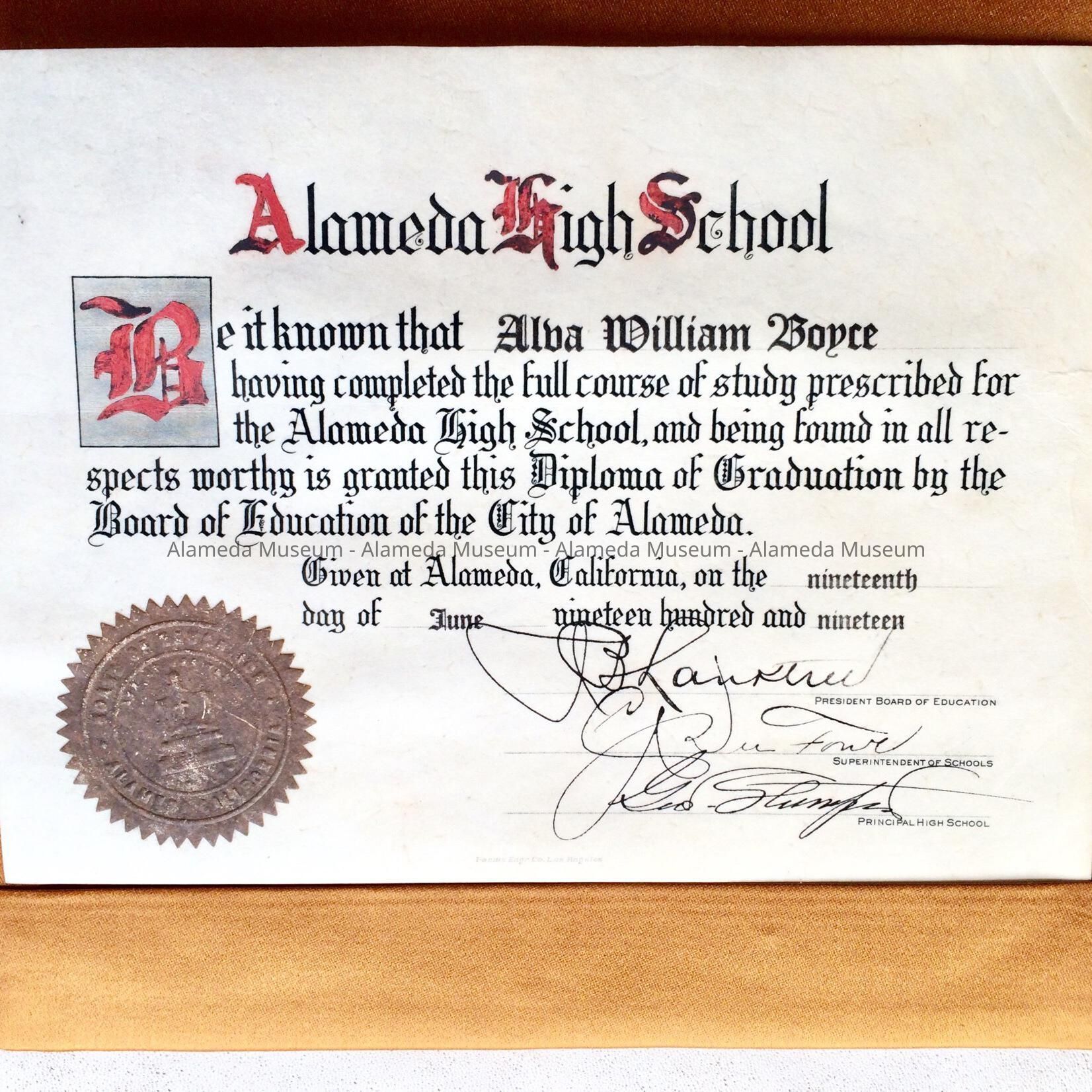 History of Object: Diploma awarded Alva William Boyce from the Alameda High School, dated June 19th, 1919.