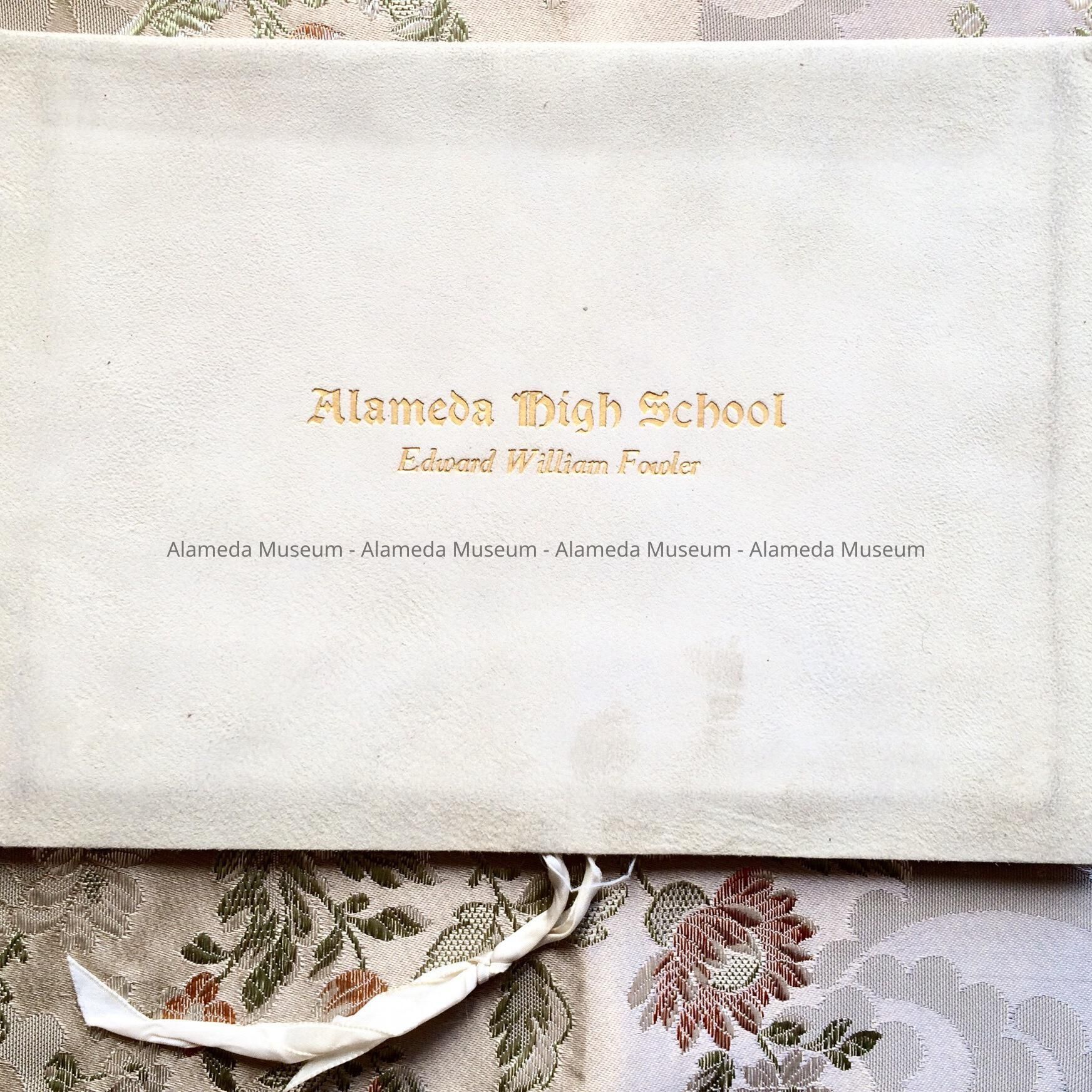 Description: Printed diploma (ornate type) on imitation parchment paper, white colored kid cover (orange colored silk lining). Incised gold lettering on cover stating "Alameda High School."