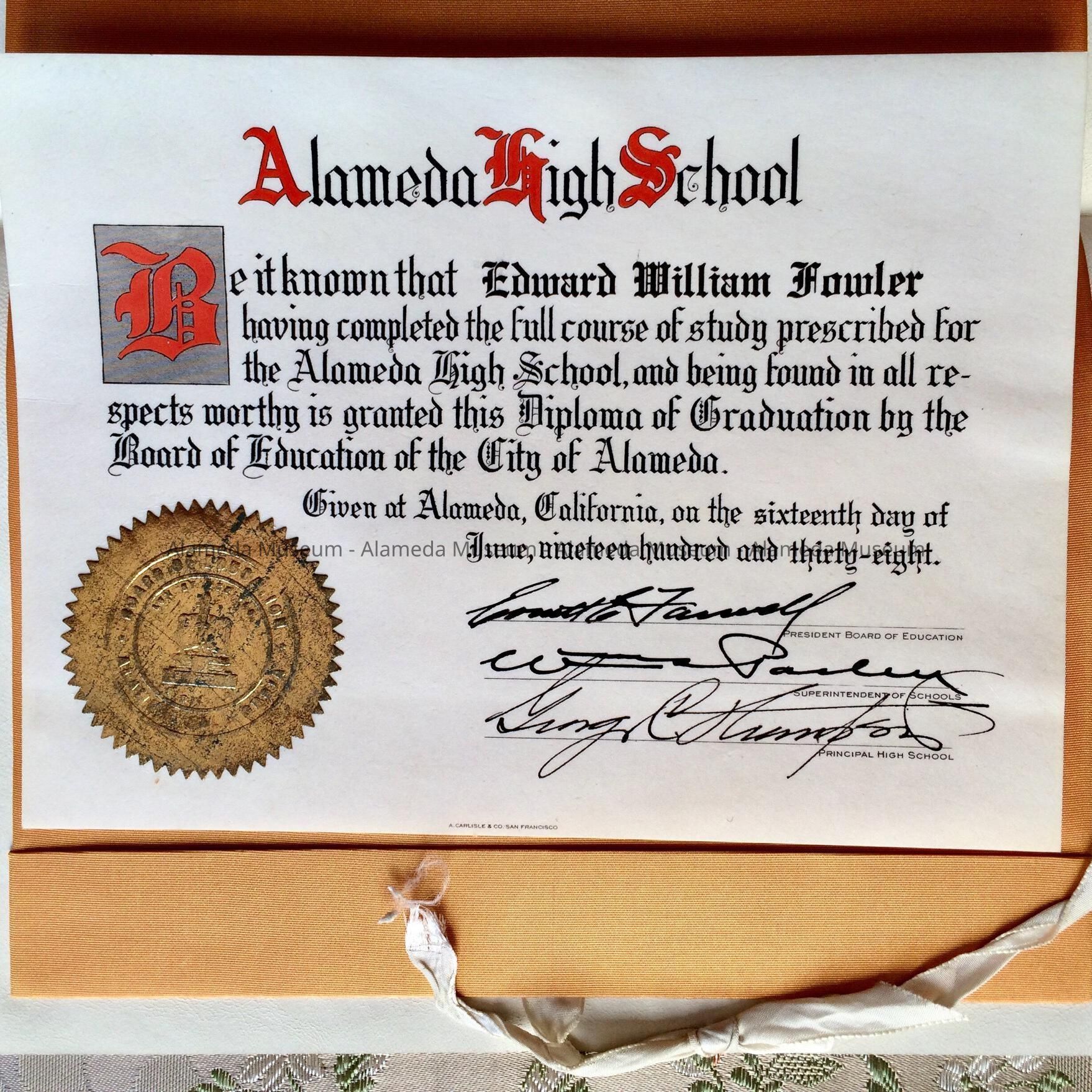 Diploma awarded to Edward Wm. Fowler, Alameda High School, June 16, 1938.