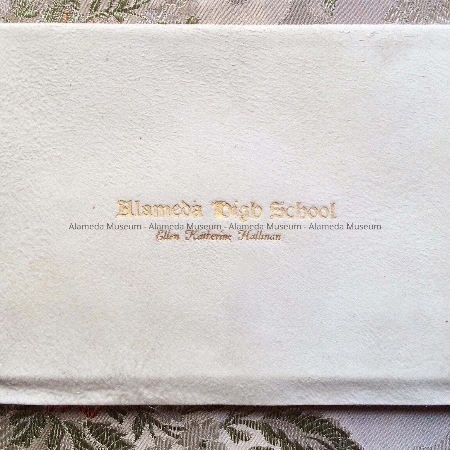 Description: Diploma form with ornate type in black and red color printed on imitation parchment paper. Embossed seal, in gold, of the Board of Education lower left hand corner. Original white kid coverlet or jacket with incise gold lettering on cover stating "Alameda High School".