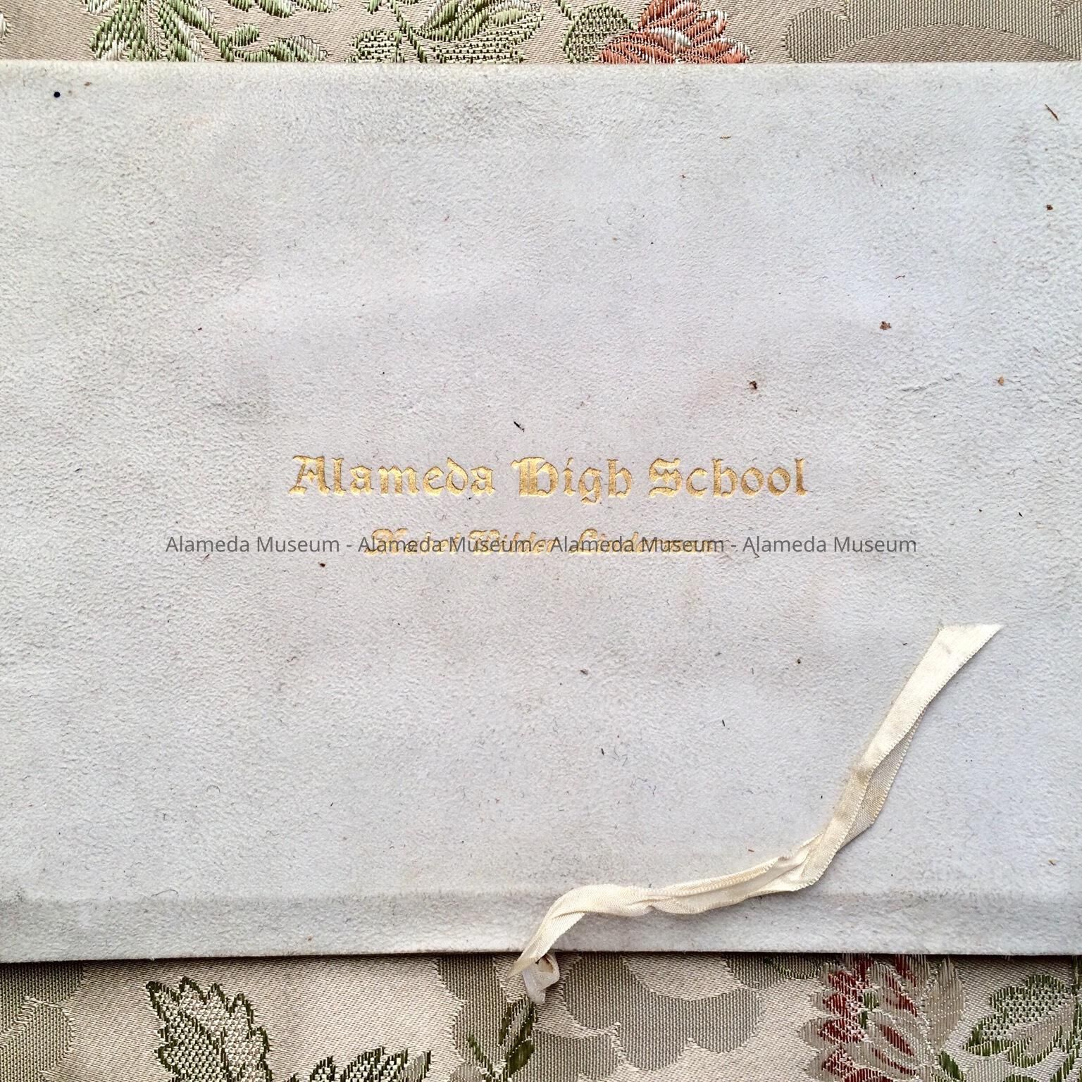 A DIPLOMA FORM PRINTED IN ELABORATE RED- AND BLACK-COLORED TYPE ON AN OFF-WHITE IMITATION PARCHMENT PAPER. DOCUMENT IS HOUSED IN THE ORIGINAL WHITE KID COVERLET, LINED WITH GOLD SILK. COVER HAS INCISED CAPTION, "ALAMEDA HIGH SCHOOL, MABEL WILDER LINDERMAN."