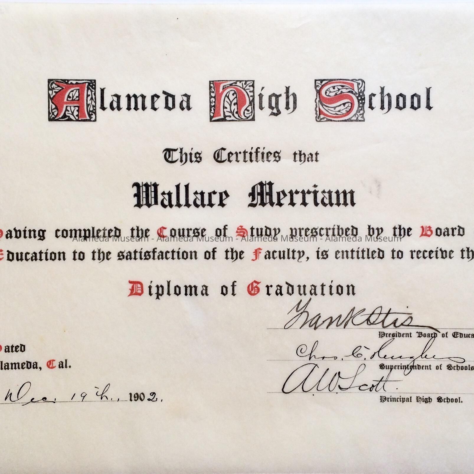 History of Object: Alameda High School diploma of Wallace Merriam, graduate of 1902. He married Edna Ethel Moulthrop (graduate of A.H.S, 1906) and resided at 1324 Caroline St., in a home that they had built in 1915.