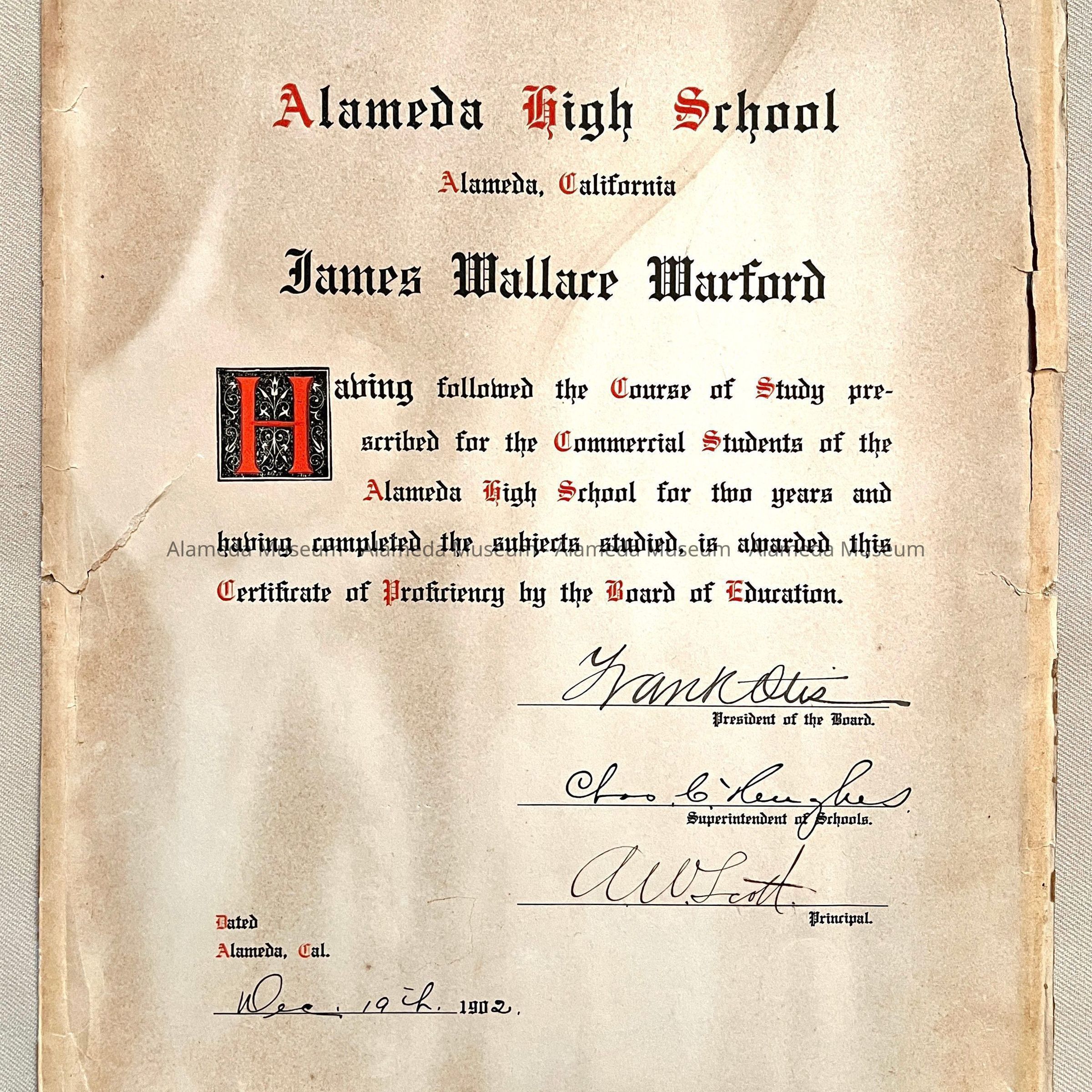 History of Object: Diploma, dated 1902, of James Wallace Warford, Alameda High School. It is signed by Frank Otis, Pres. of the Board of Education, later to become the Mayor of Alameda.