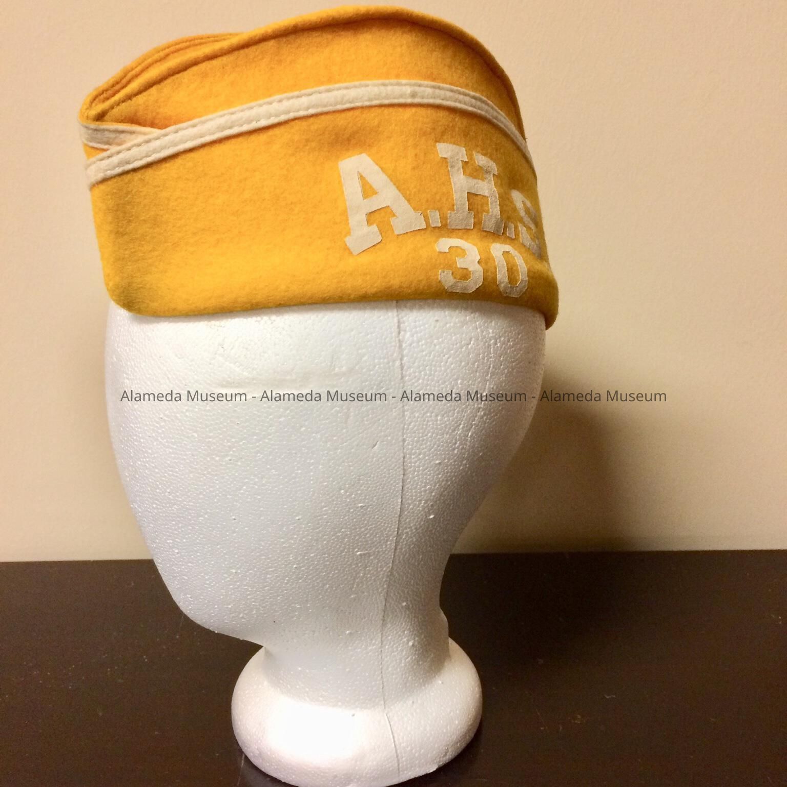 Description: Oblong gold colored felt hat with white trim and letters "A.H.S., 30.