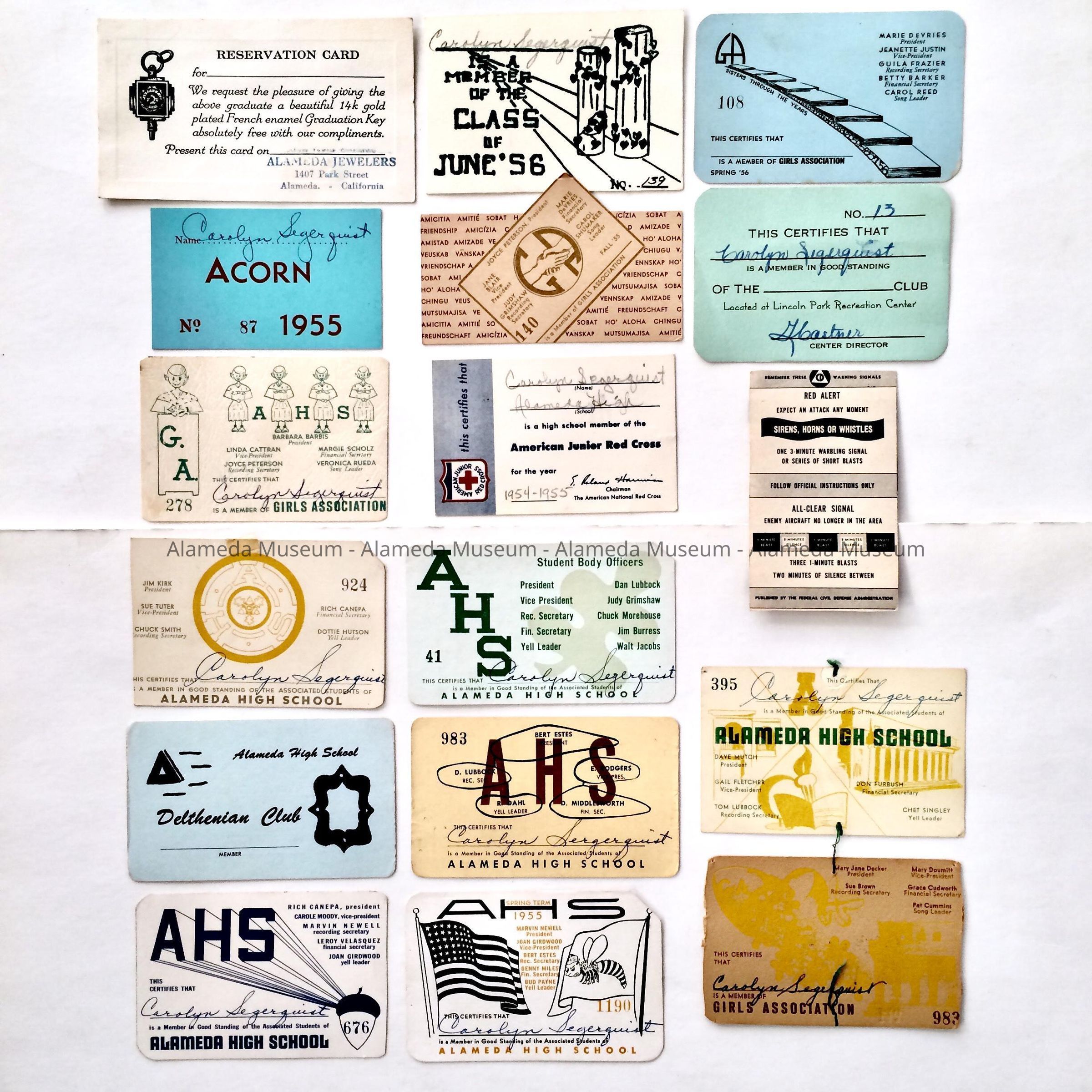 Alameda High School membership cards of Carolyn Segerquist, 1950sEntry/Object ID