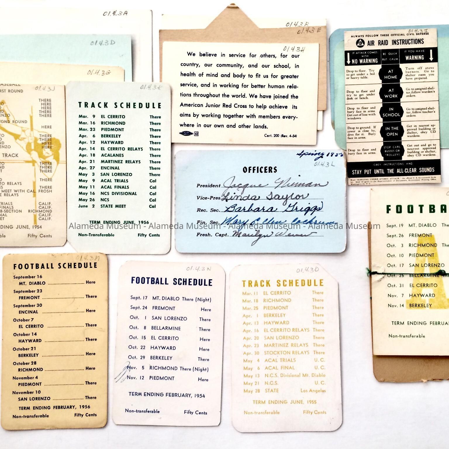 History: Membership cards including student body issued to the donor as a student of Alameda High School. Her maiden name was Segerquist.