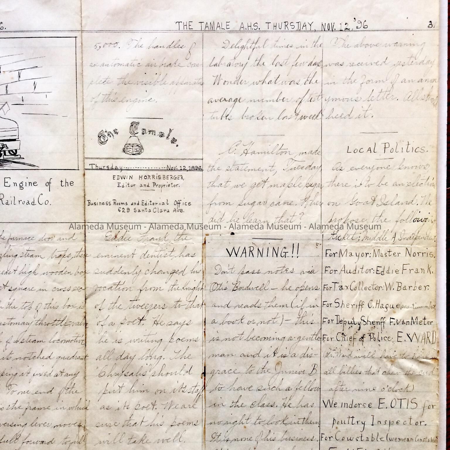 HAND WRITTEN AND ILLUSTRATED NEWSPAPER OF THE ALAMEDA HIGH SCHOOL, JUNE THROUGH NOVEMBER OF 1896. THE NEWSPAPER CONTAINS MANY PEN AND INK DRAWINGS, NOTABLY ONE OF PRESIDENT MCKINLEY