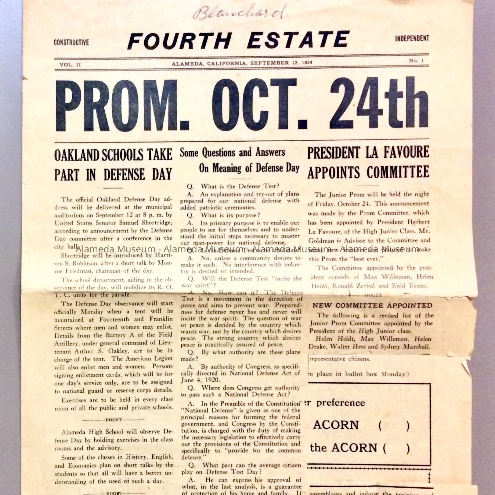 AN ALAMEDA HIGH SCHOOL NEWSPAPER ENTITLED, "THE FOURTH ESTATE," IN BLACK-COLORED TYPE ON A WHITE-COLORED BACKGROUND. THE NEWS PAPER WAS DATED SEPTEMBER 12, 1924.