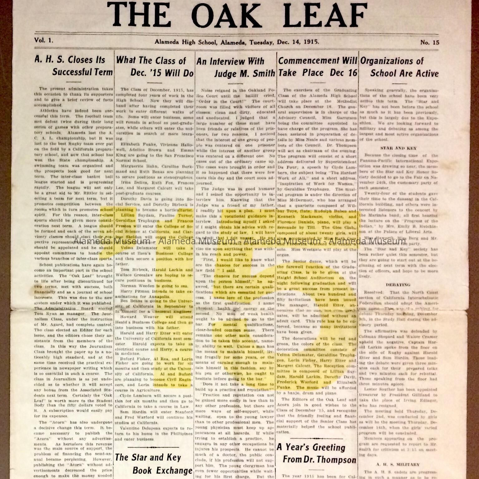 Alameda High School newspaper 'The Oak Leaf', December 14, 1915Entry/Object ID