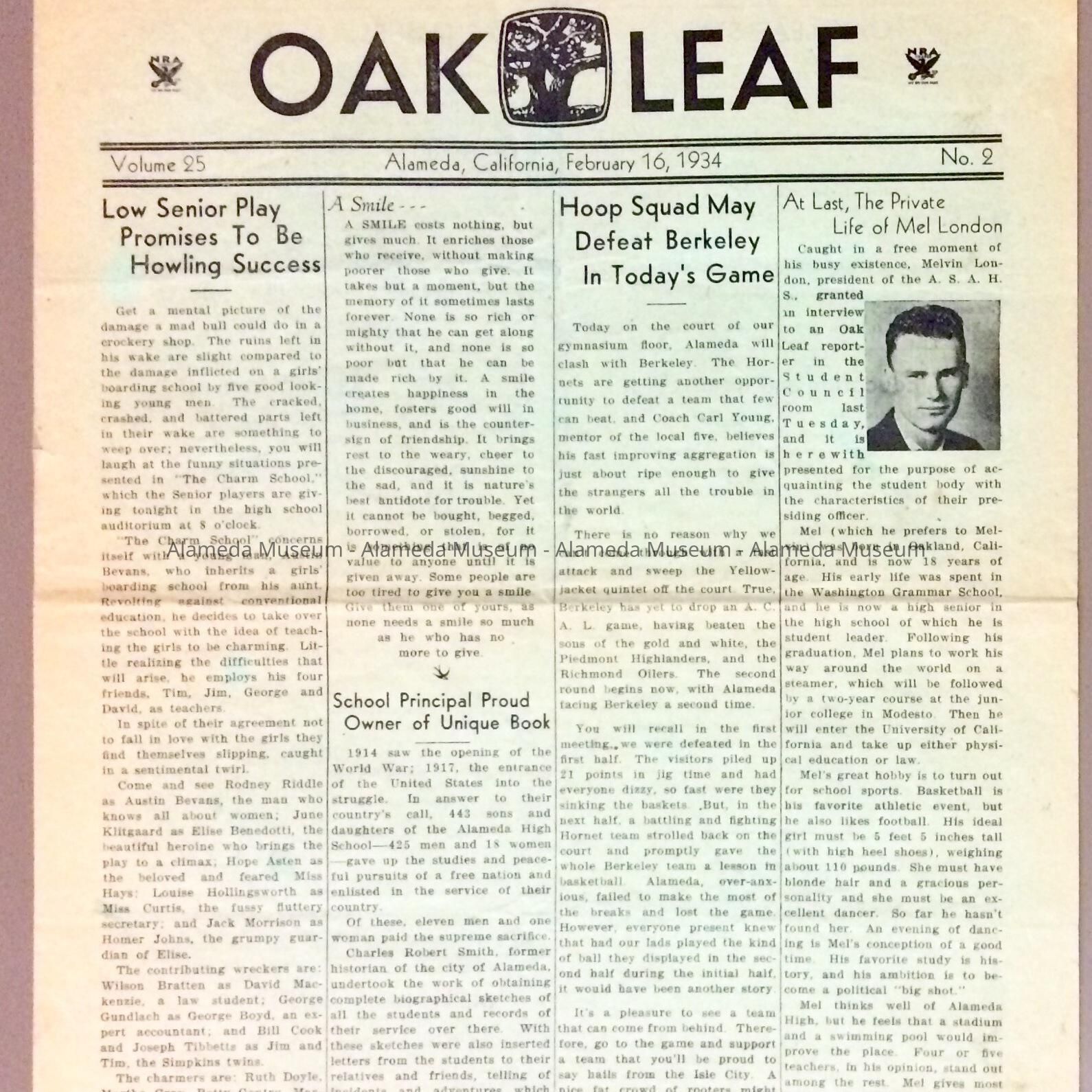 History: February 16, 1934 edition of "The Oak Leaf", a newspaper published by the Alameda High School.