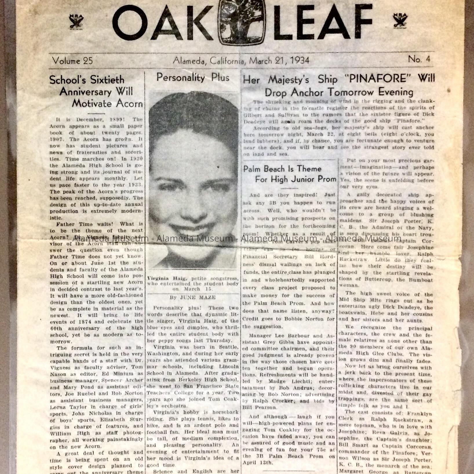 History: March 21, 1934 edition of "The Oak Leaf", a newspaper published by the Alameda High School.