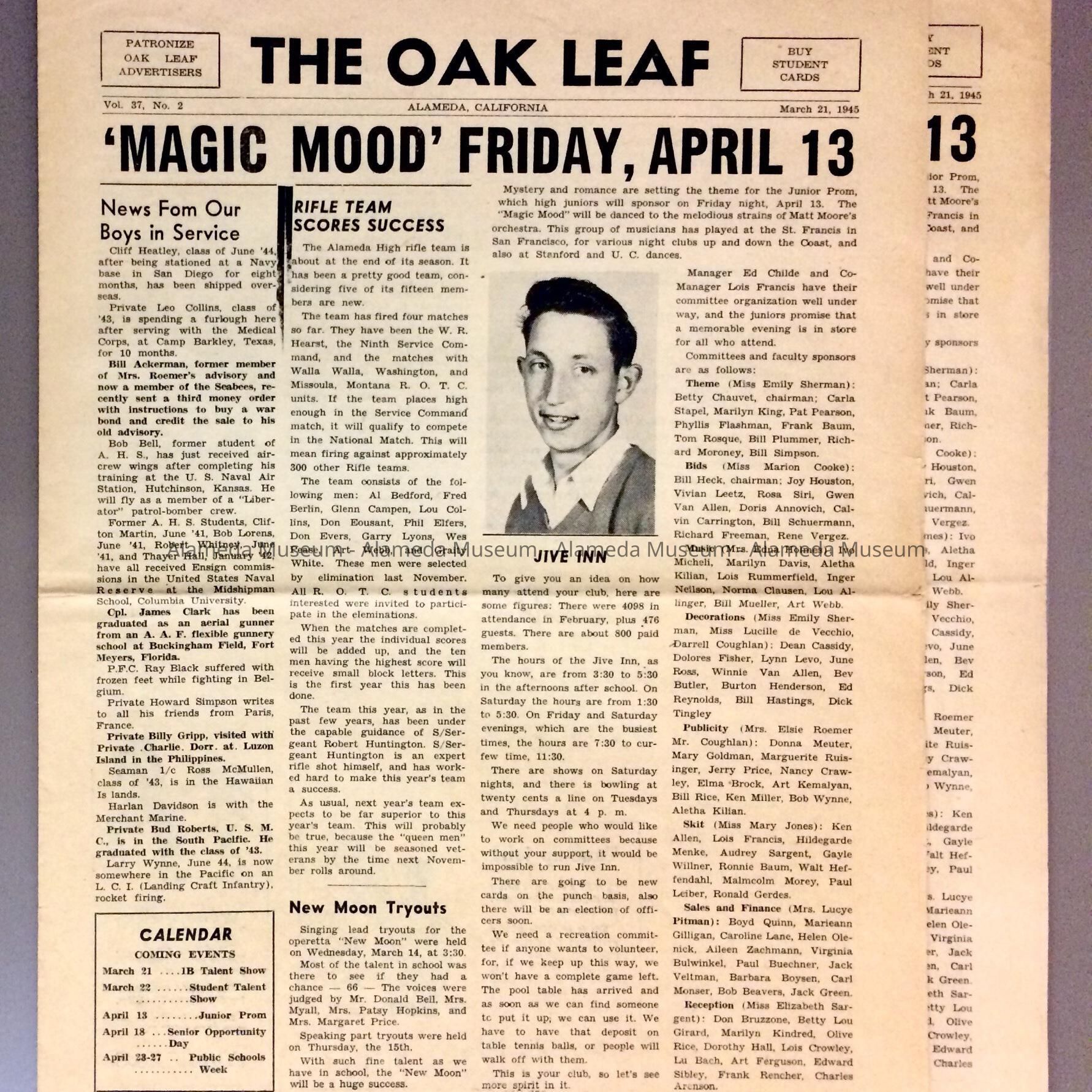 HISTORY OF OBJECT: "THE OAK LEAF", ALAMEDA HIGH SCHOOL NEWS PAPER, MARCH 21, 1945
