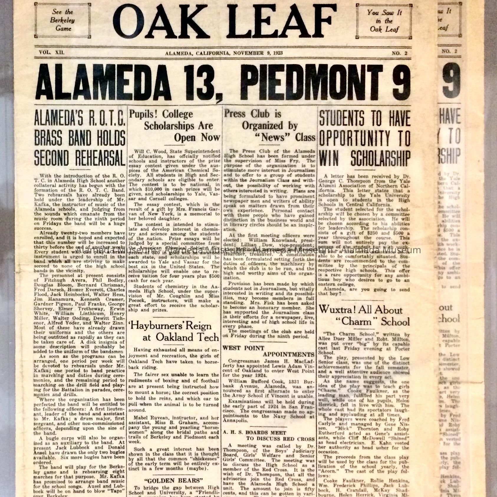 Alameda High School newspapers 'The Oak Leaf', November 9, 1923Entry/Object ID