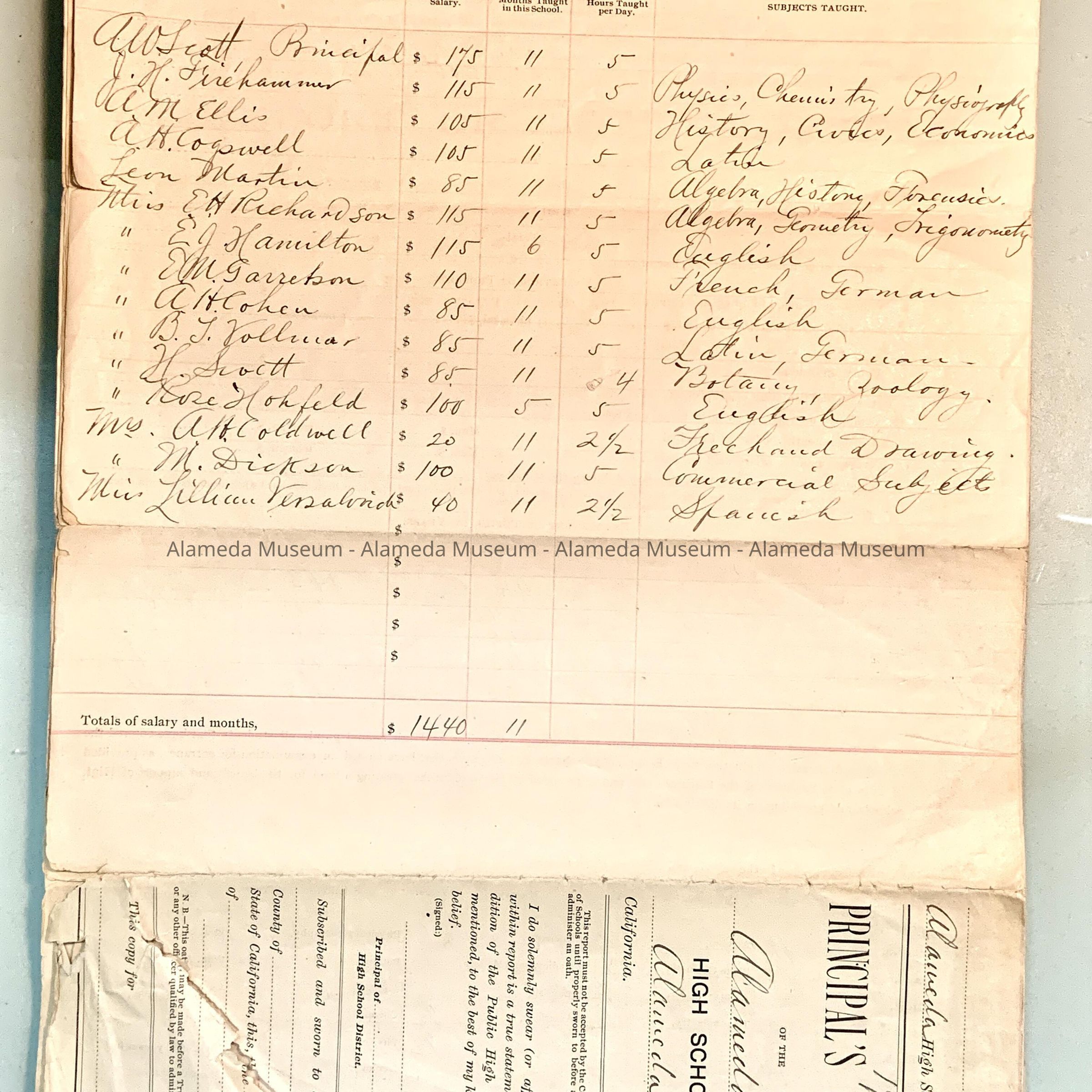 Reports of salaries, absences, etc. for the Alameda High School for the years 1903, 1904, 1905, 1906, 1907, 1908 and 1909.