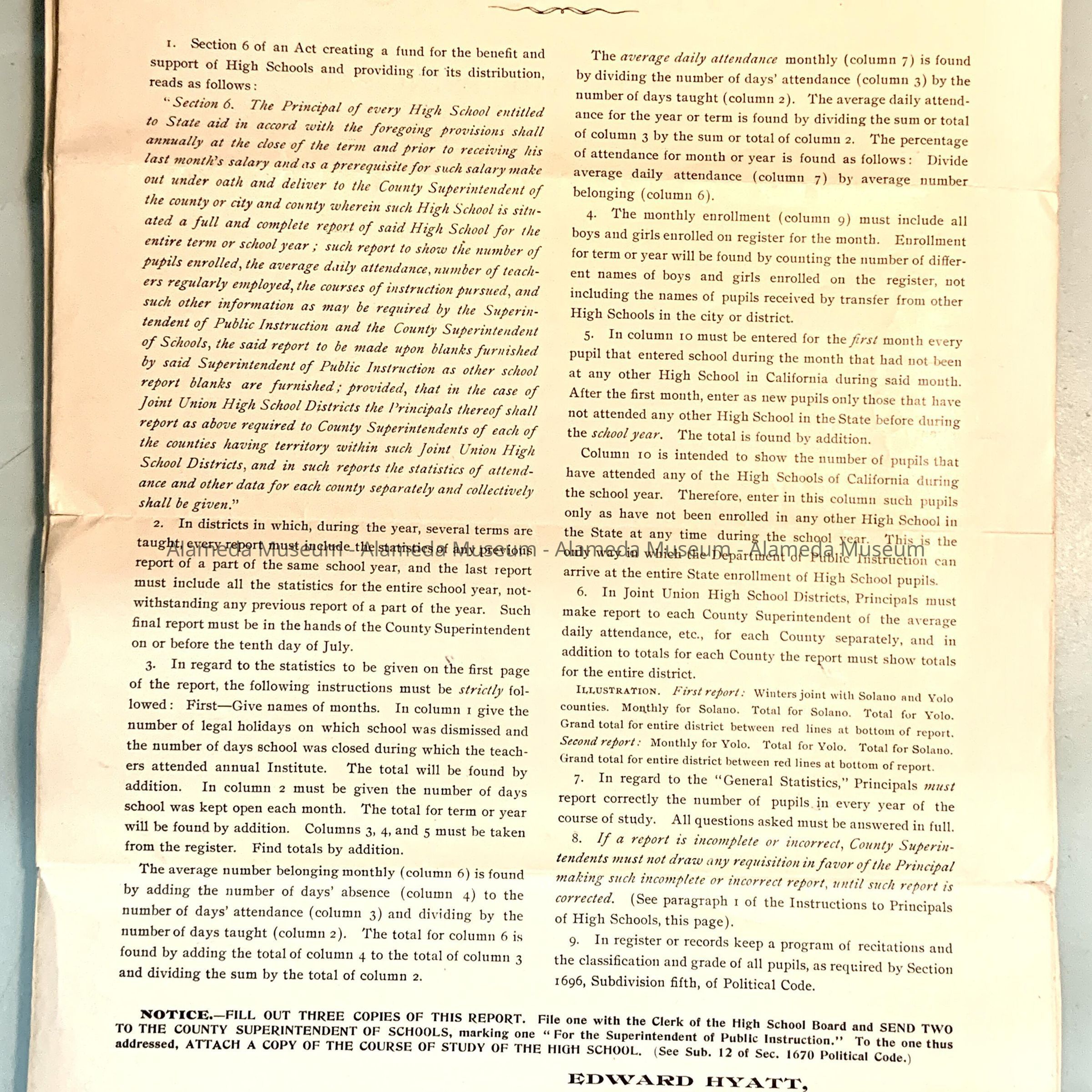 Description: Report forms folded double vertically, titled 'Principal's Report of the ... School' with the blank filled in in ink: Alameda, or 'High School Principal's Report'.