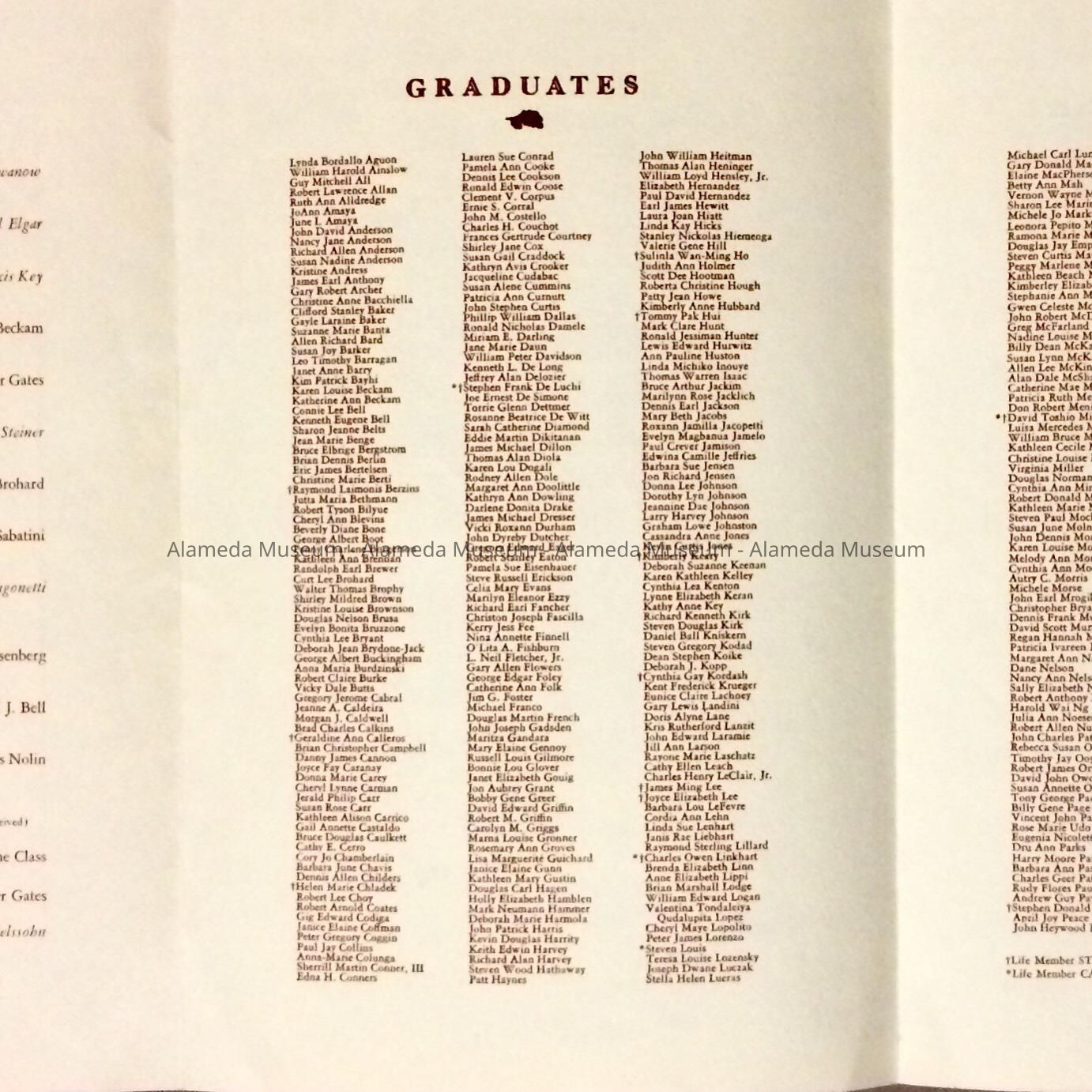 Description: 2-page program, folded in three sections, printed on ecru-colored paper with bold-printed caption on cover, "Commencement, Alameda High School" in sepia-colored print. Includes a list of graduates, awards, and class officers.