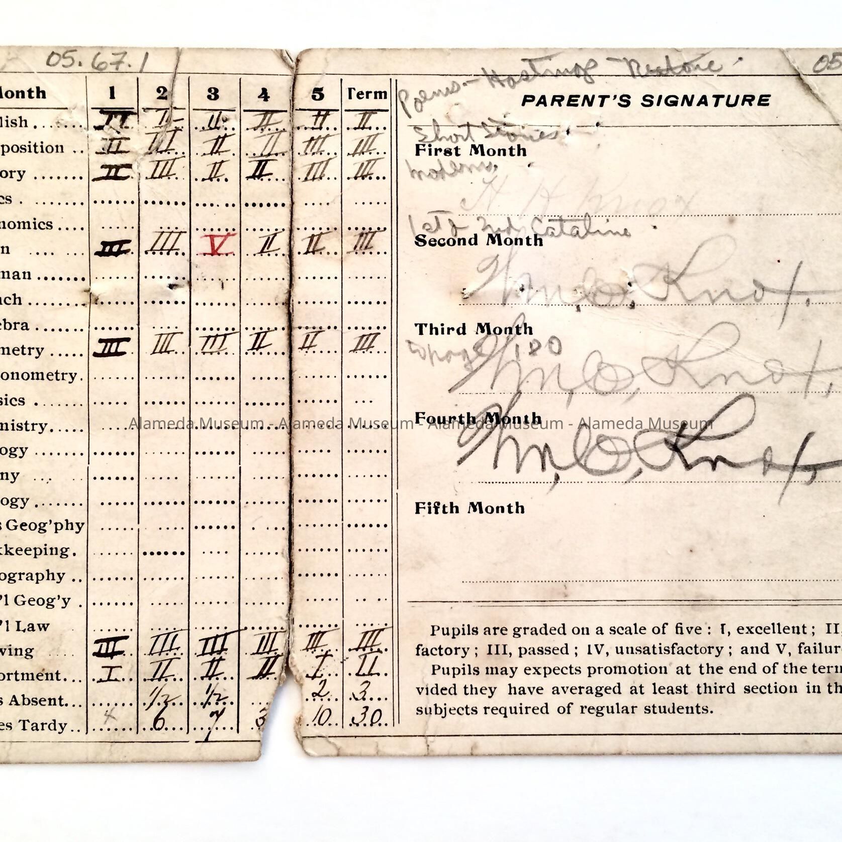 HISTORY OF OBJECT: REPORT CARD FOR THE LATE DANIEL KNOX FOR THE TERM WHICH ENDED IN DECEMBER OF 1901 AT ALAMEDA HIGH SCHOOL. MR. KNOX LATER BECAME AN ATTORNEY AND CITY JUDGE IN ALAMEDA.