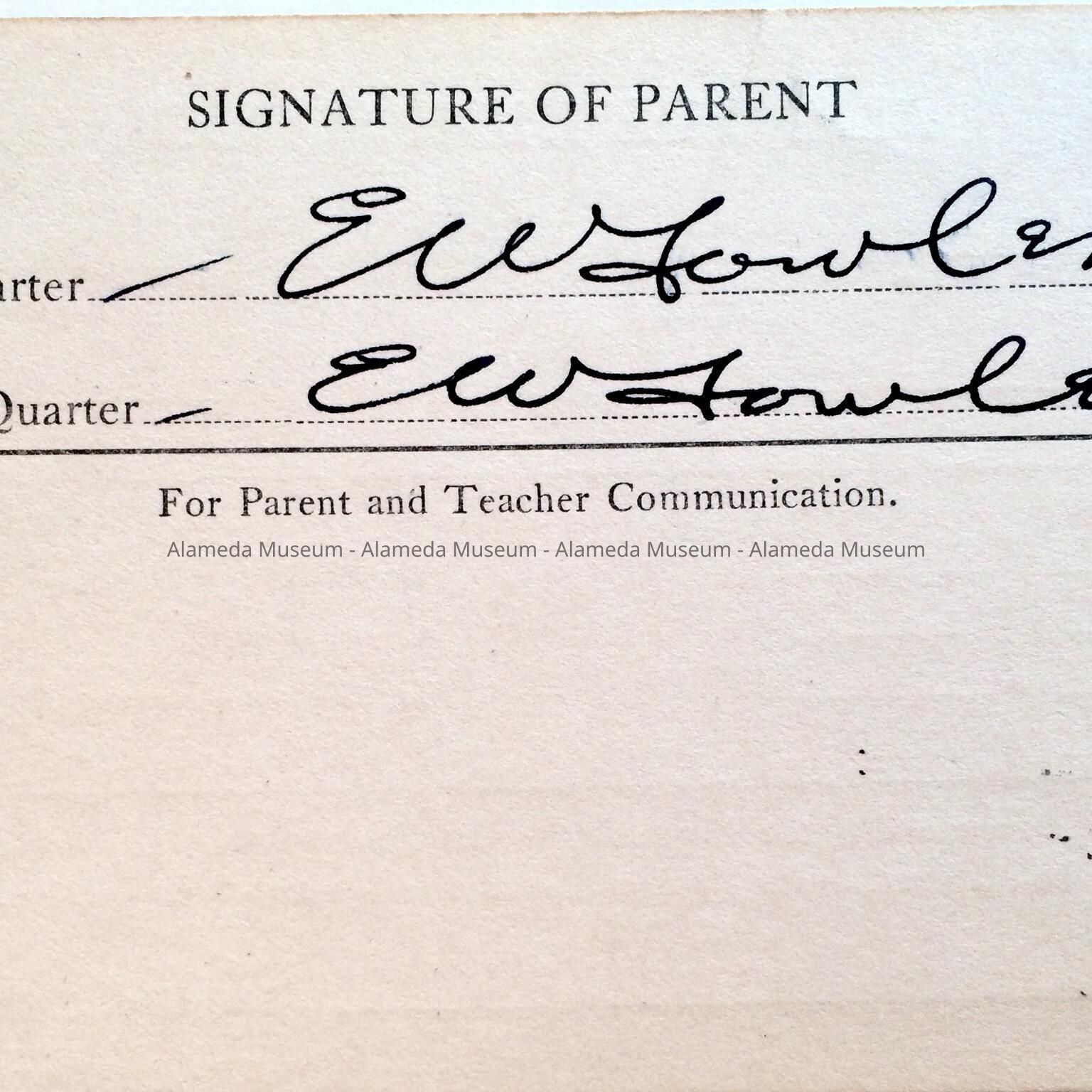 History: Report cards for the late Edward Fowler from Alameda High School. Mr. Fowler, a lifelong resident of the City, served in the Navy during World War II and was present at the bombing of Pearl Harbor. The family home was located at 1210 Pearl Street.