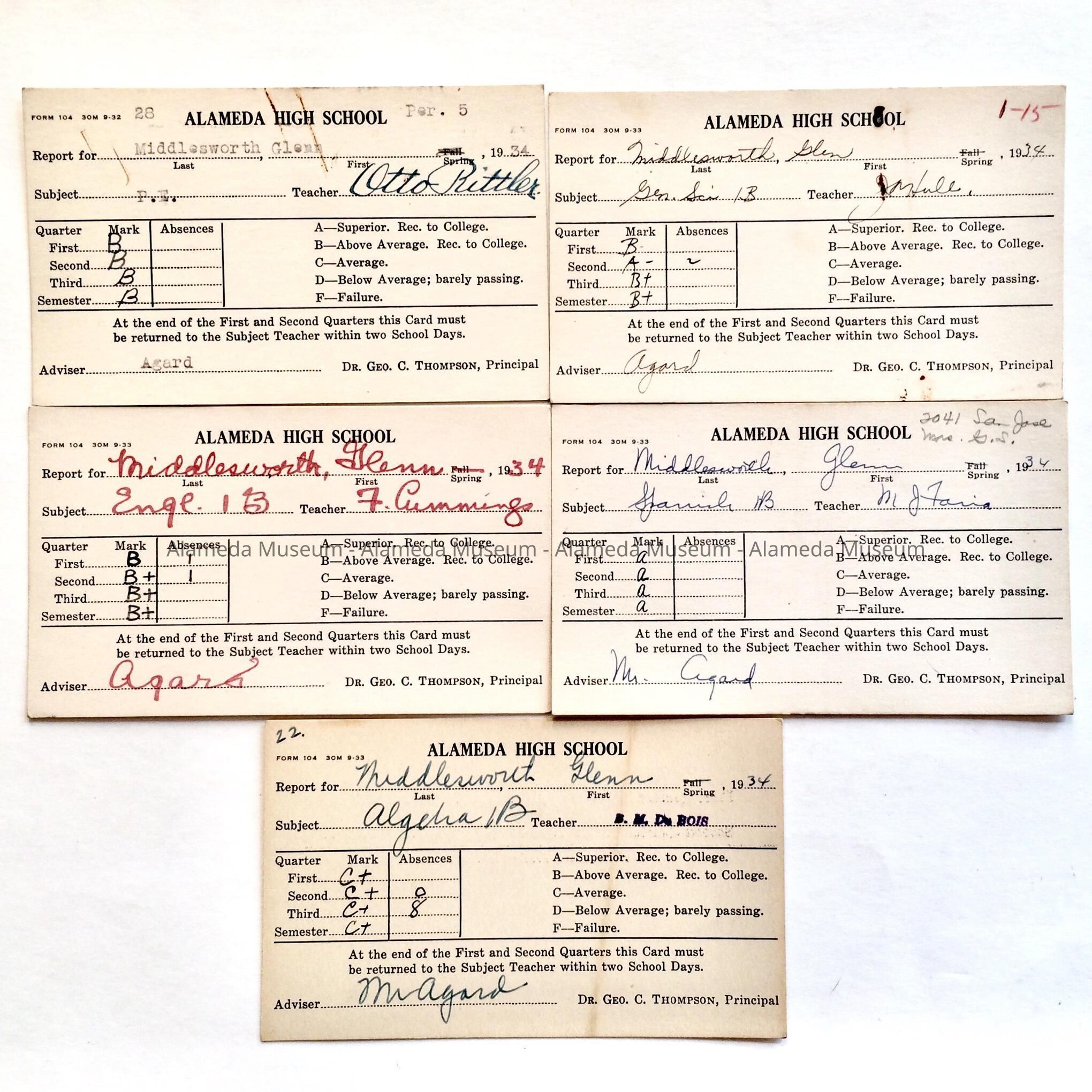History of Object: Report cards (5) of Glenn Middlesworth, Alameda High School, Spring session, 1934.