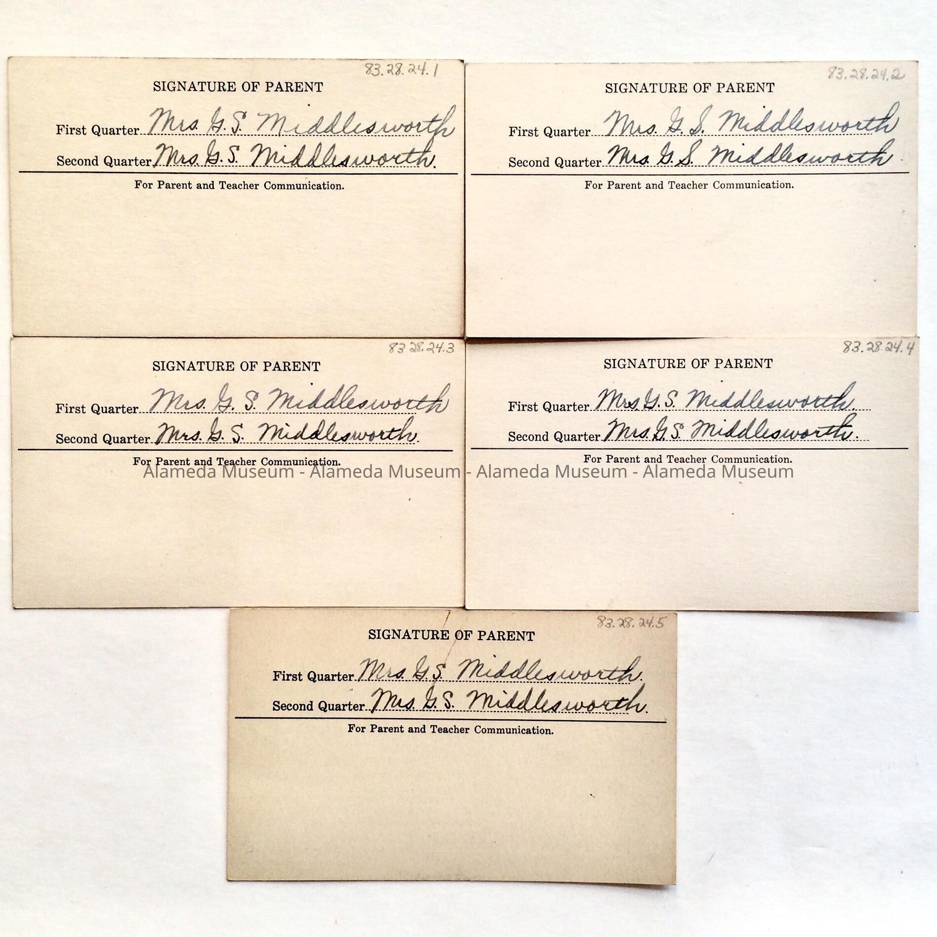 Description: 83.28.24.1 through 5, printed report cards with blanks for transcribing information (grade, teacher, parents signature, etc.), bold caption "Alameda High School". Information transcribed in blue ink (one typed).