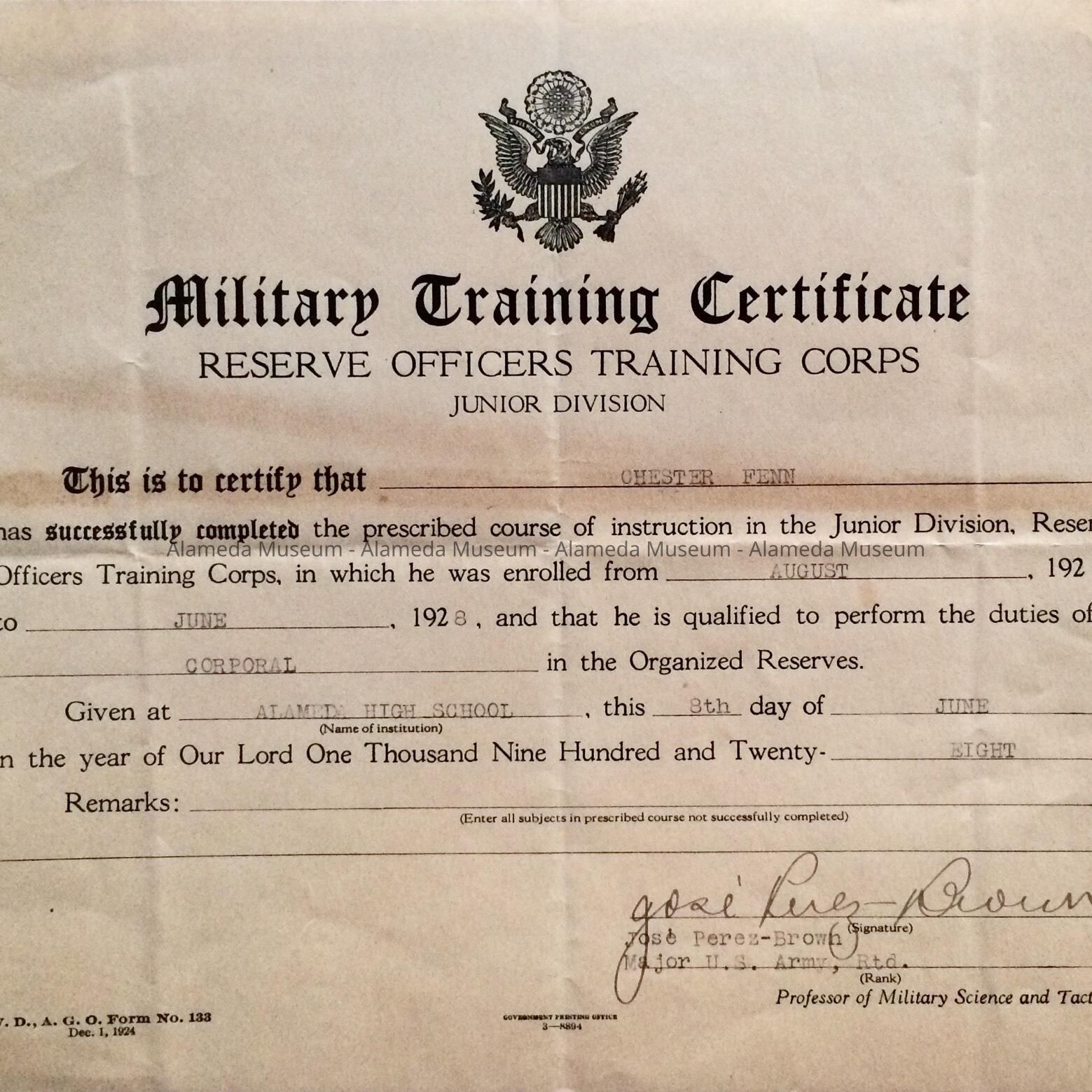History of Object: Certificate awarded to Chester Fenn, of 2038 Alameda Avenue, from the ROTC program at Alameda High School for completion of instructions, from August 1924 to June 1928, in the rank of corporal.