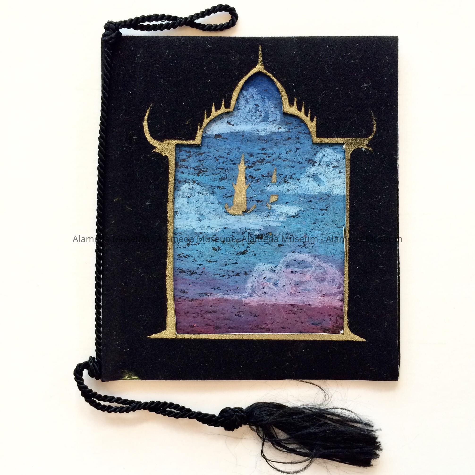 SOFT-BOUND DANCE CARD, WITH COVER OF PAPER WITH A FELT FLOCKING. COVER DESIGN IS IN A HORIZONTAL MOTIF WHICH APPEARS TO BE A HAND-DRAWN DESIGN IN MULTI-COLORED PASTELS. INTERIOR IS PRINTED ON BLACK PAPER.