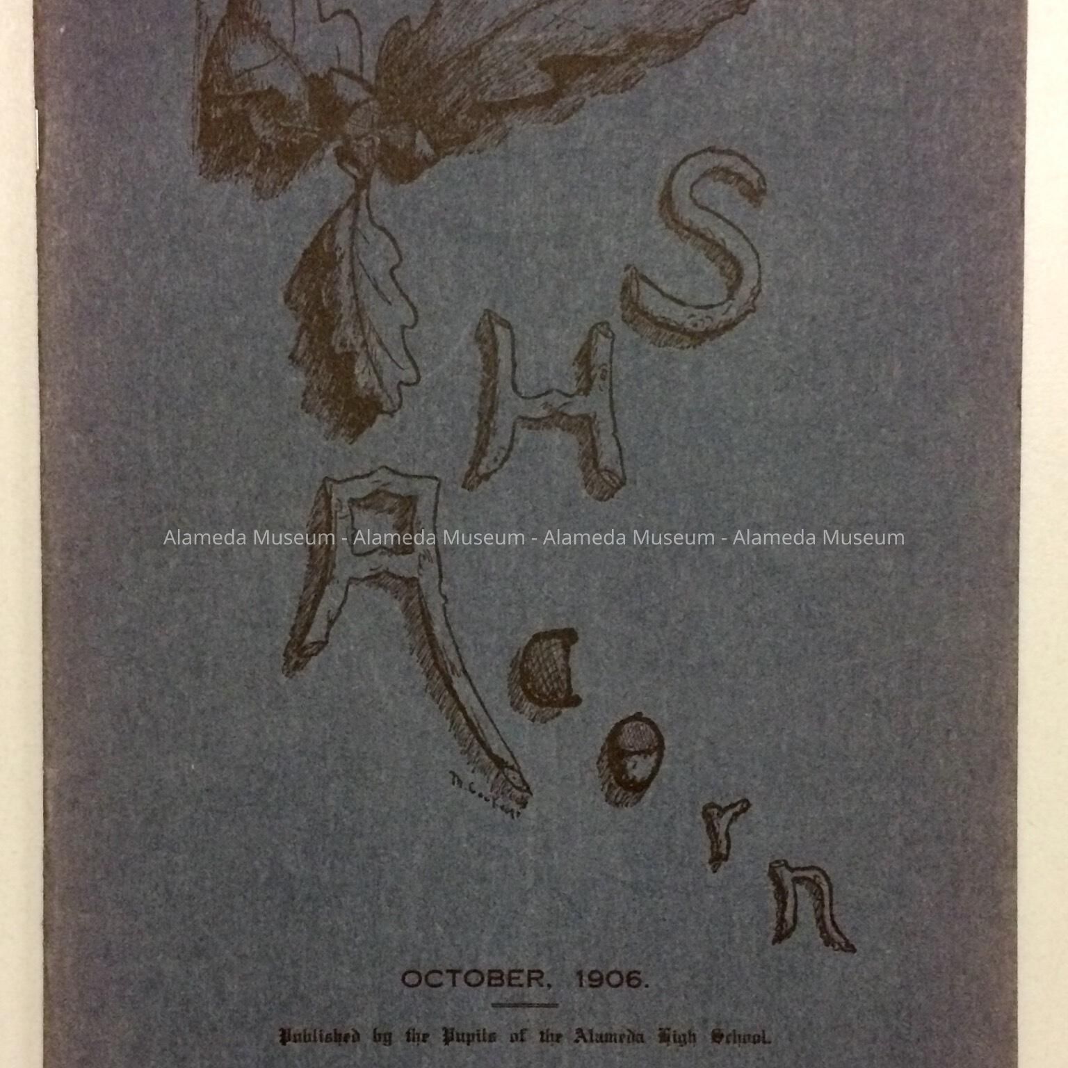 HISTORY OF OBJECT: THE OCTOBER 1906 EDITION OF THE ALAMEDA HIGH SCHOOL PUBLICATION TITLED, "THE ACORN." "THE ACORN," EVENTUALLY EVOLVED INTO THE OFFICIAL YEARBOOK OF ALAMEDA HIGH SCHOOL. THE PUBLICATION ALSO INCLUDES ADVERTISEMENTS FOR LOCAL BUSINESSES.