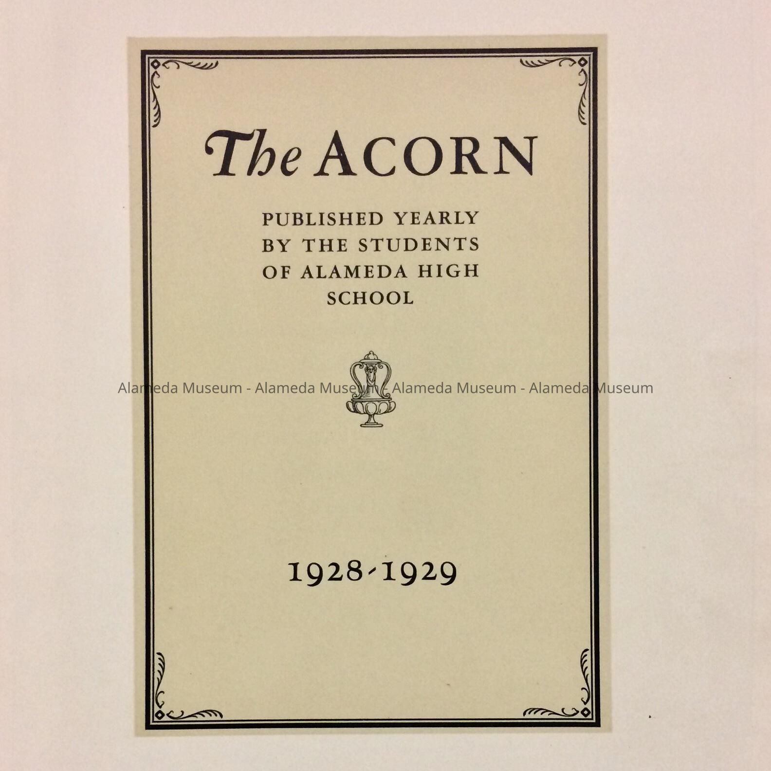 1929 edition of the Alameda High School yearbook "The Acorn". This particular copy belonged to Laura Craven Healey. Mrs. Healey was a longtime employee of the Alameda Free Library. Given prior to 1971 and never catalogued.