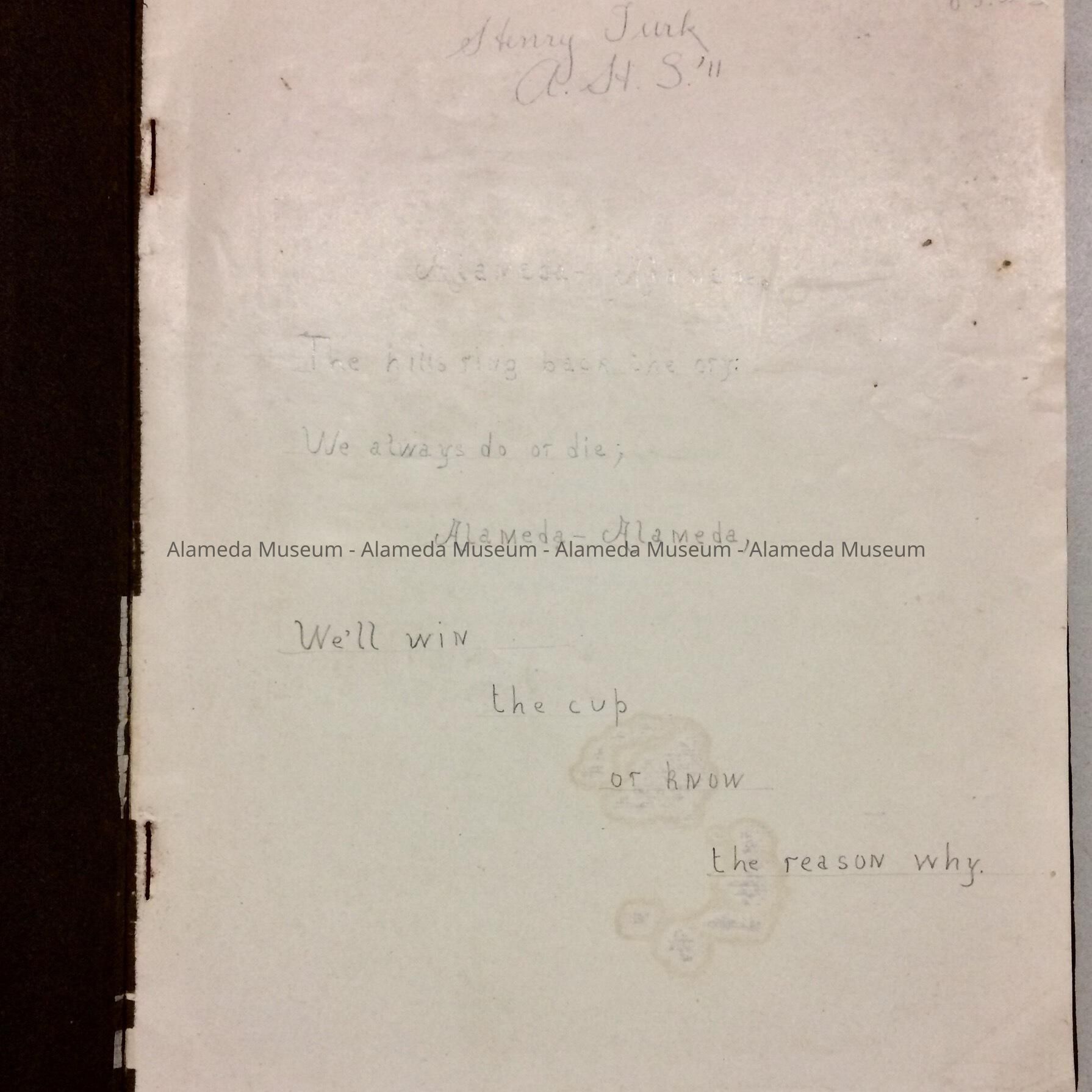 It belonged to Myrtle Fisher, born Alameda, 1890, graduated A.H.S., 1908, and married Sydney Wilson. Her mother, Cora Combs (married Bertrand L. Fisher) and had two children, Herald & Myrtle. Her father ran a Park Street market, known as Combs & Fisher. Cora Combs was the daughter of Milton Combs (died Alameda, 1873) an early Justice-of-the Peace.