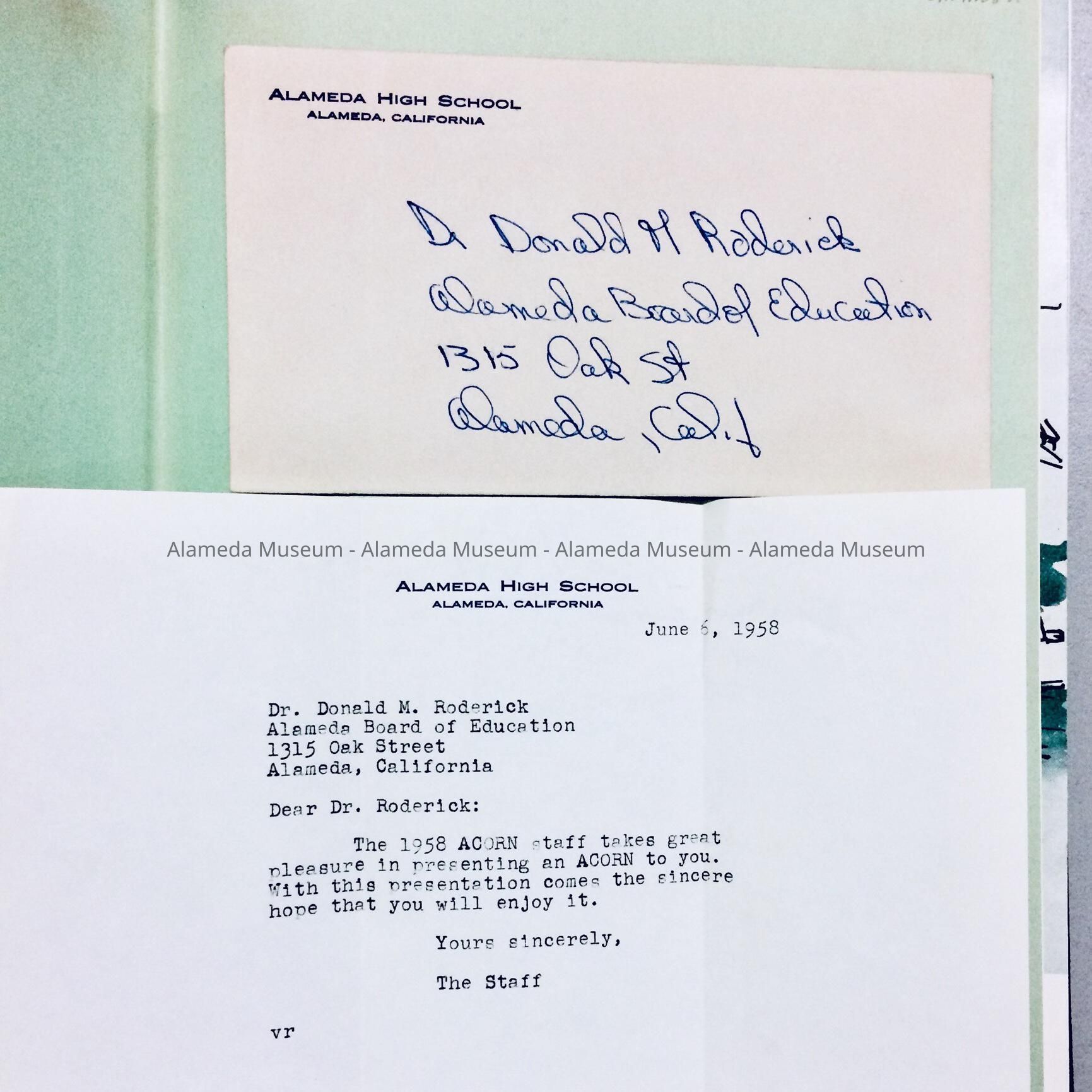 Alameda High School Yearbook 'Acorn' and letter, 1958Entry/Object ID