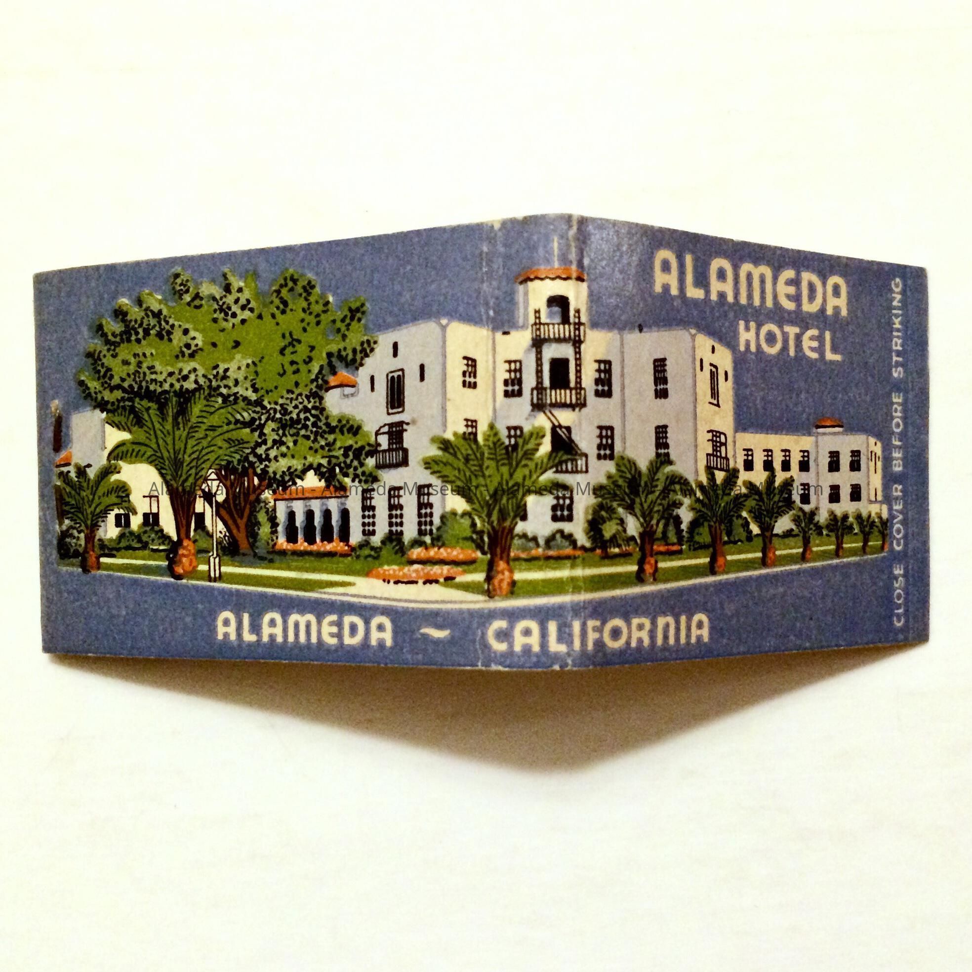 Description: Match cover (unfolded) depicts View Alameda Hotel on blue background, bold heading "Alameda Hotel, Alameda, California", green palm trees in foreground. Interior has printed information concerning hotel, manager's name, etc.