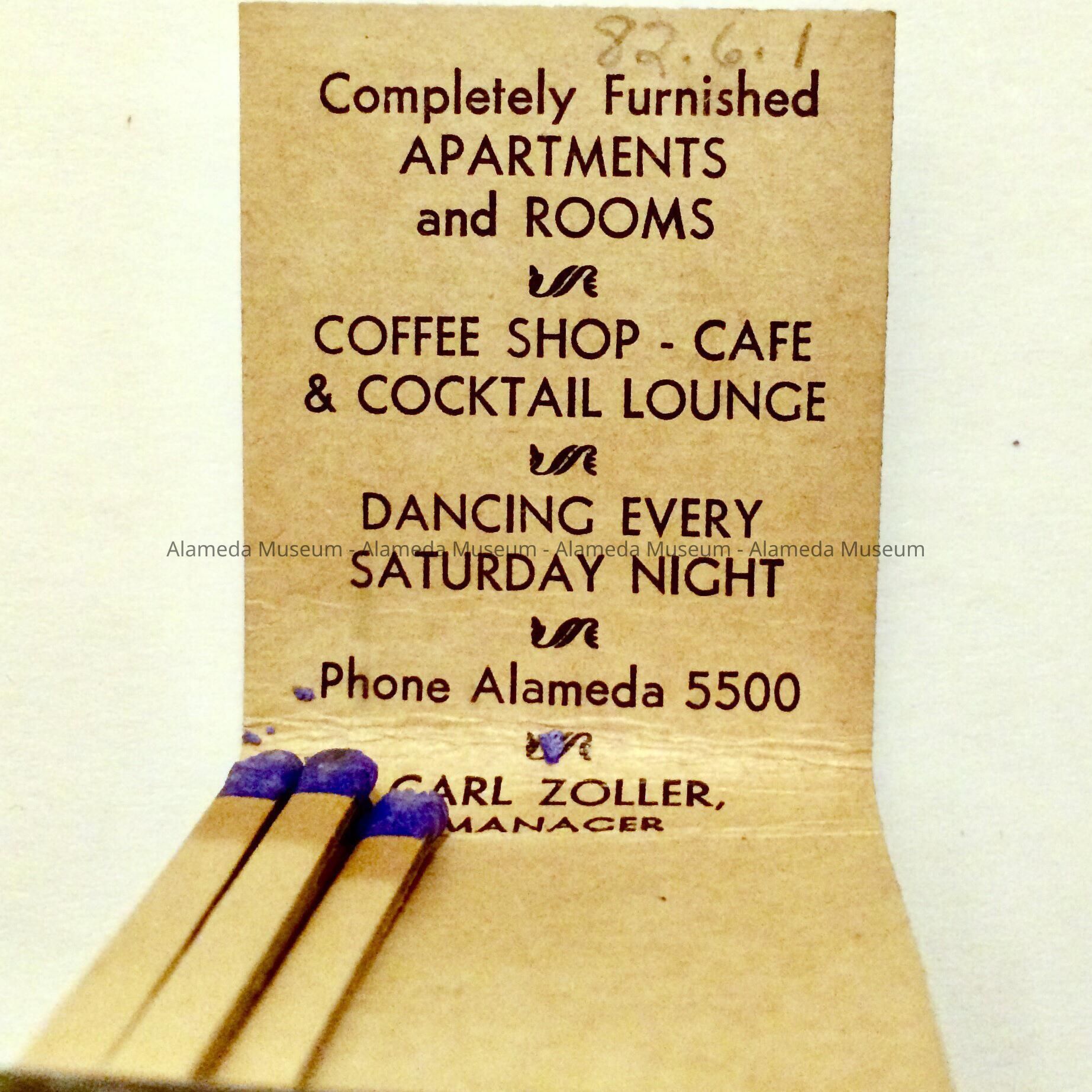 Alameda Hotel Match book Cover, c. 1940Entry/Object ID