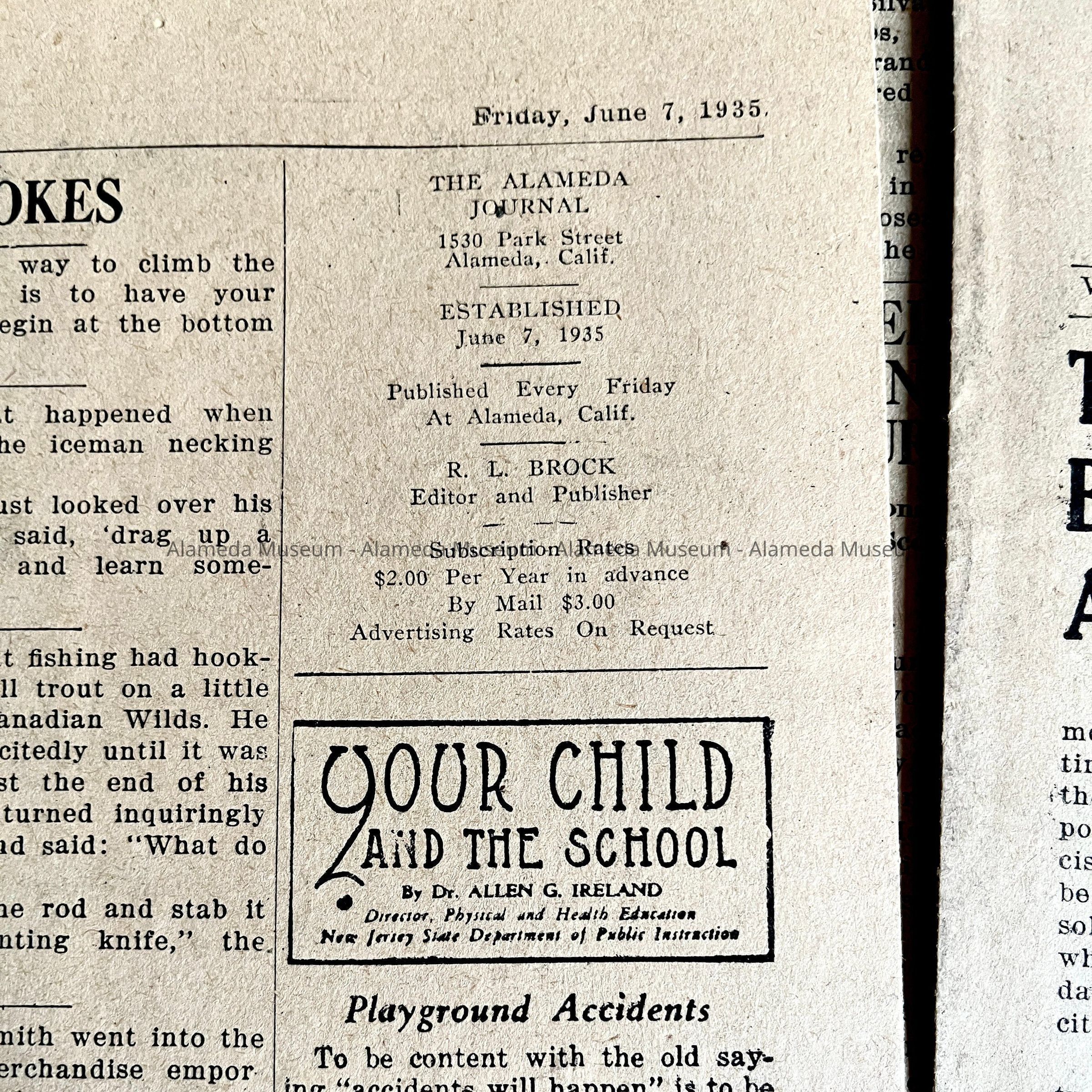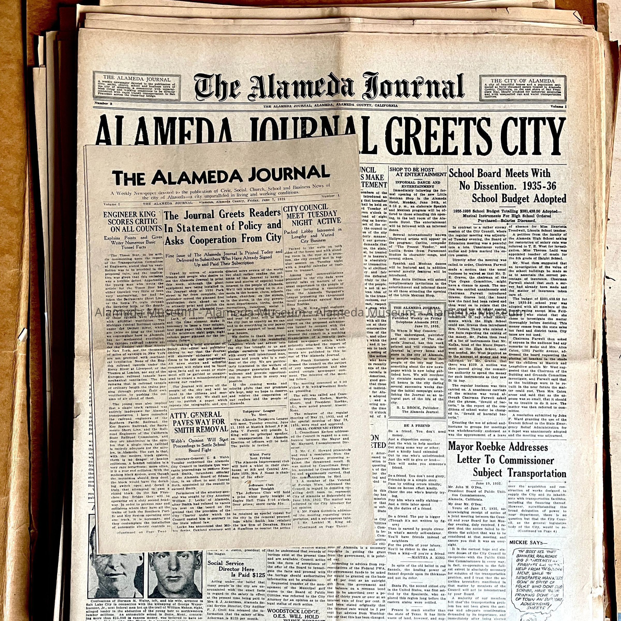 Description: First two years of editions of a newspaper titled 'The Alameda Journal’, Vol. I, No. 1 of June 7, 1935, through Volume II, No. 47, of April 23, 1937, with some 1936 and 1937 editions missing. Printed in black ink. In a loose cardboard folder.