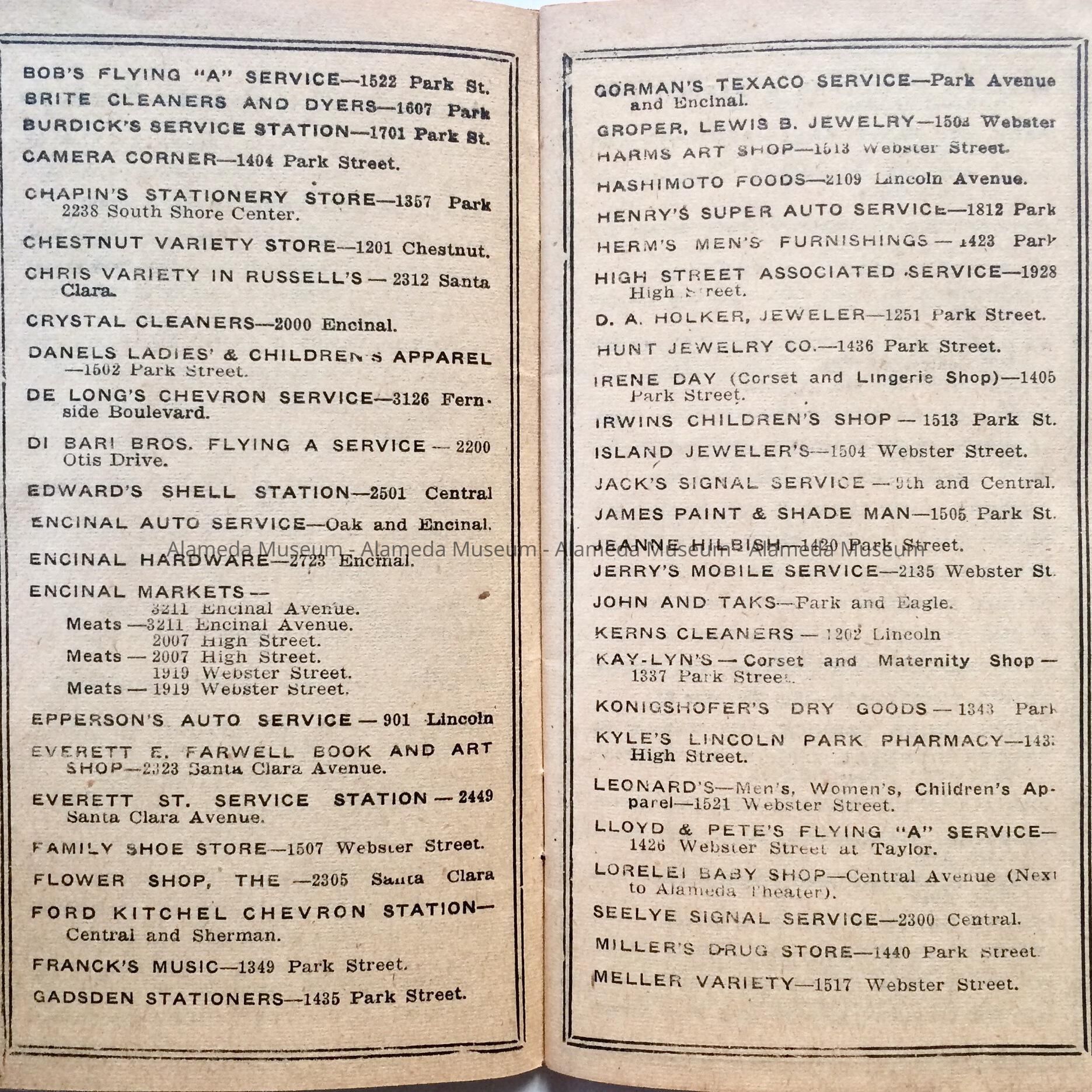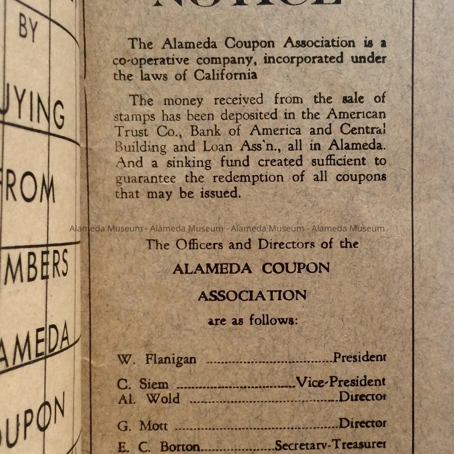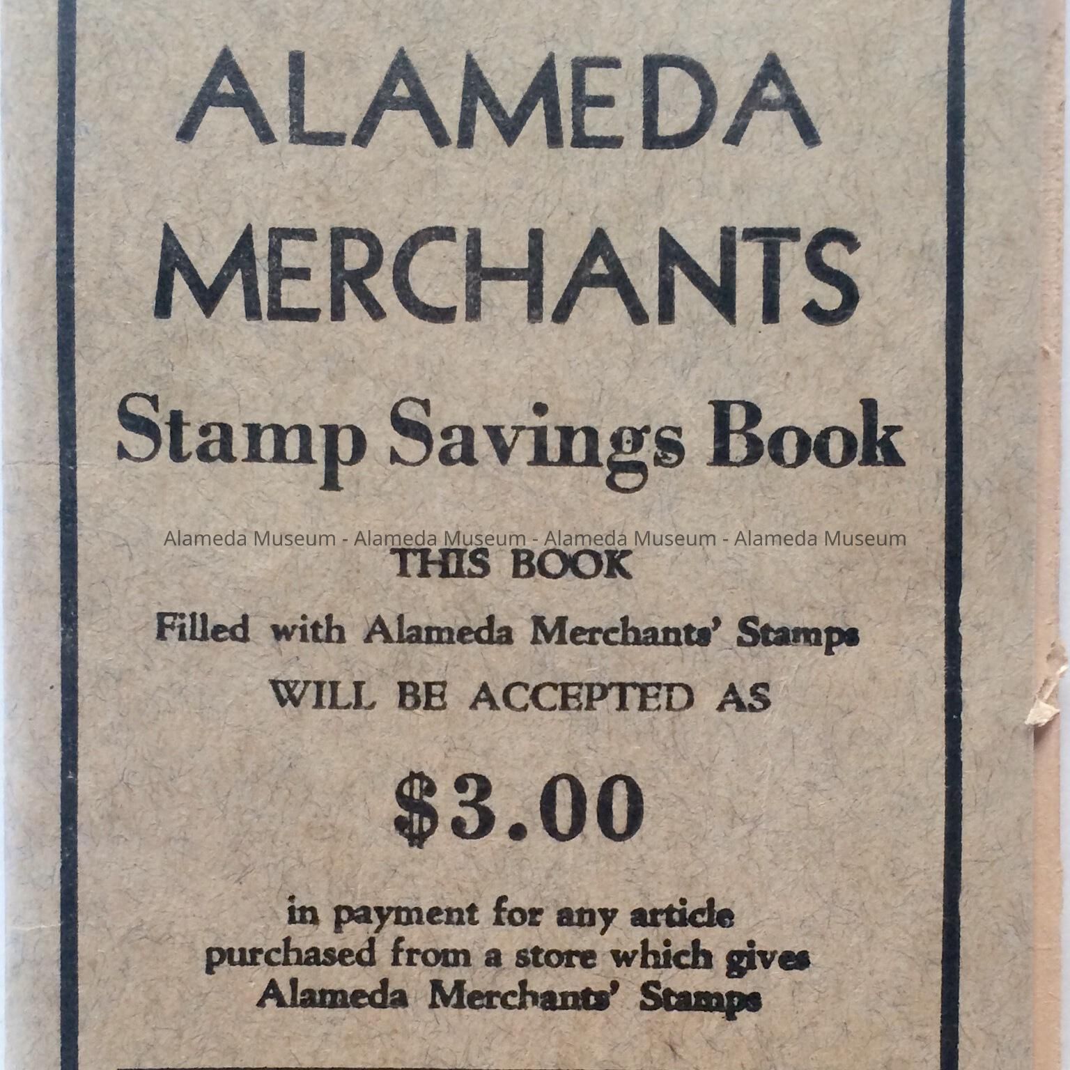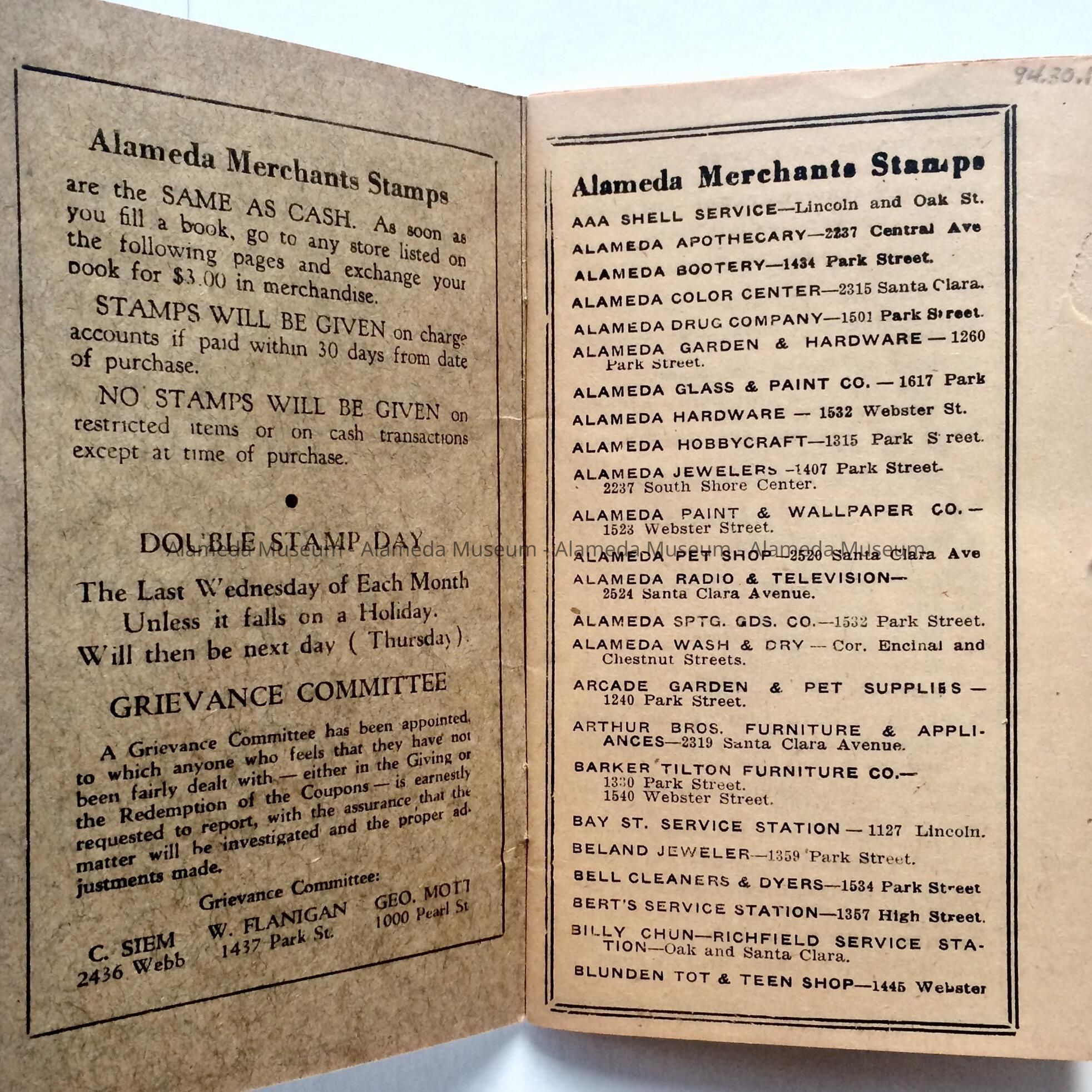 Now defunct Alameda Merchants’ Stamp book. It lists local businesses who participated in Merchant Stamps.