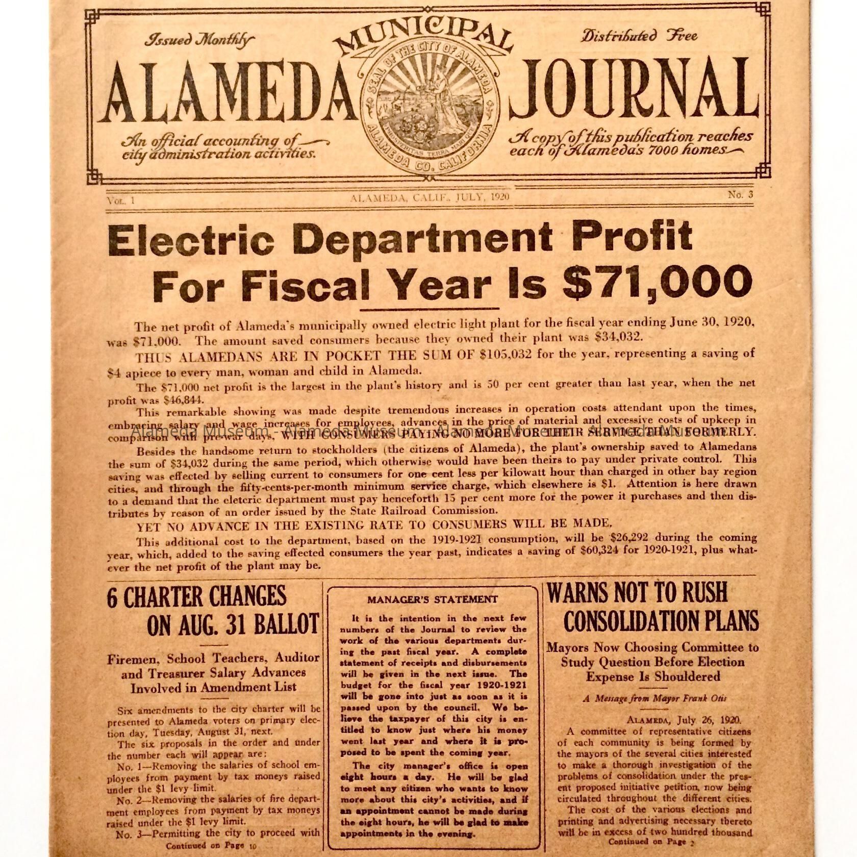 July 1920 edition of the Alameda Municipal Journal consisting of articles pertaining to the City of Alameda. Contains an article on the Electric Department's profit.