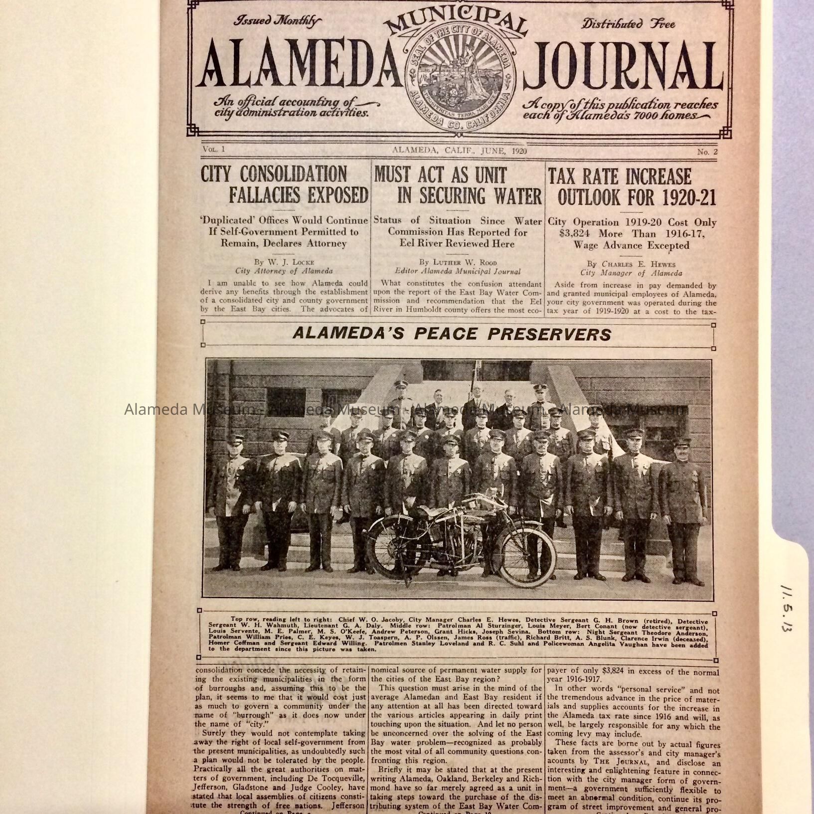 A. Alameda Municipal Journal Vol.1 June 1920 No. 2. Printed on newsprint, 12 pages. Cover has photo insert of Alameda Police personnel.