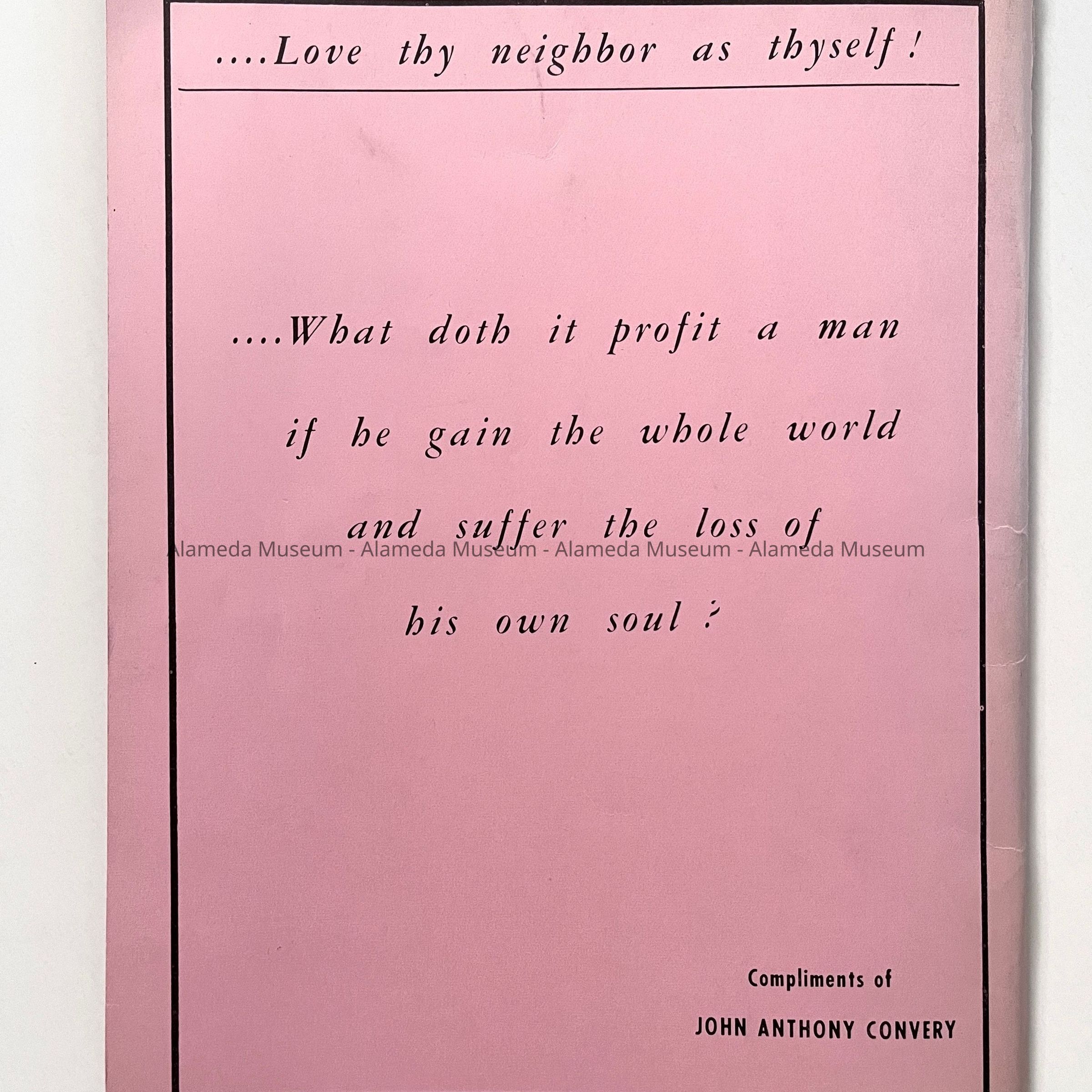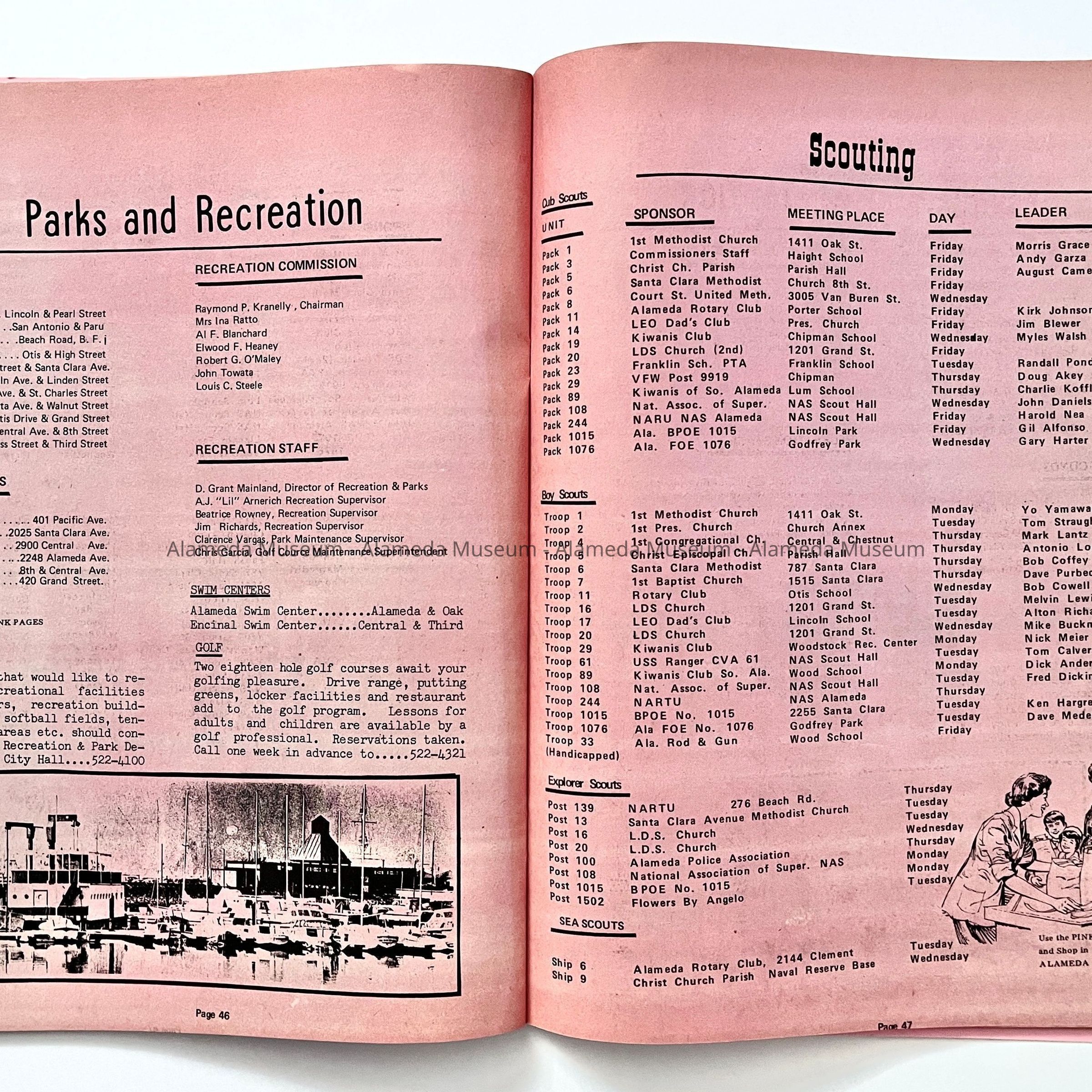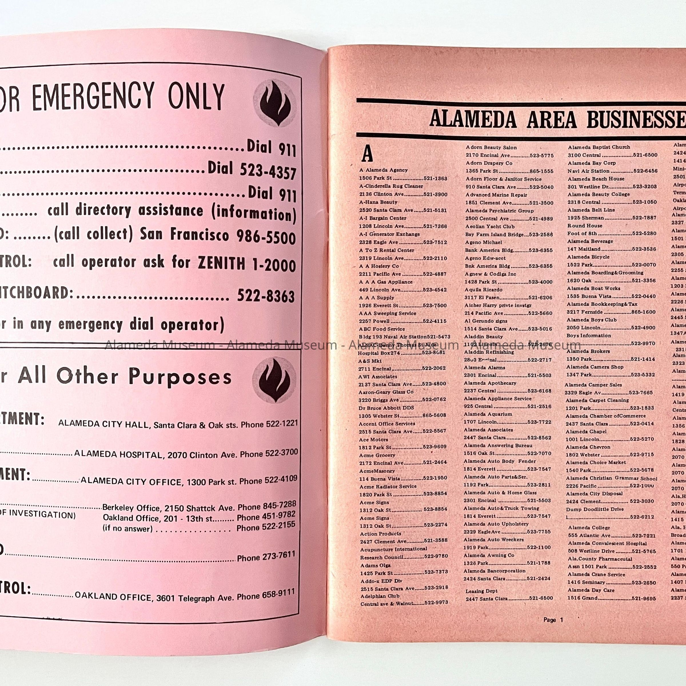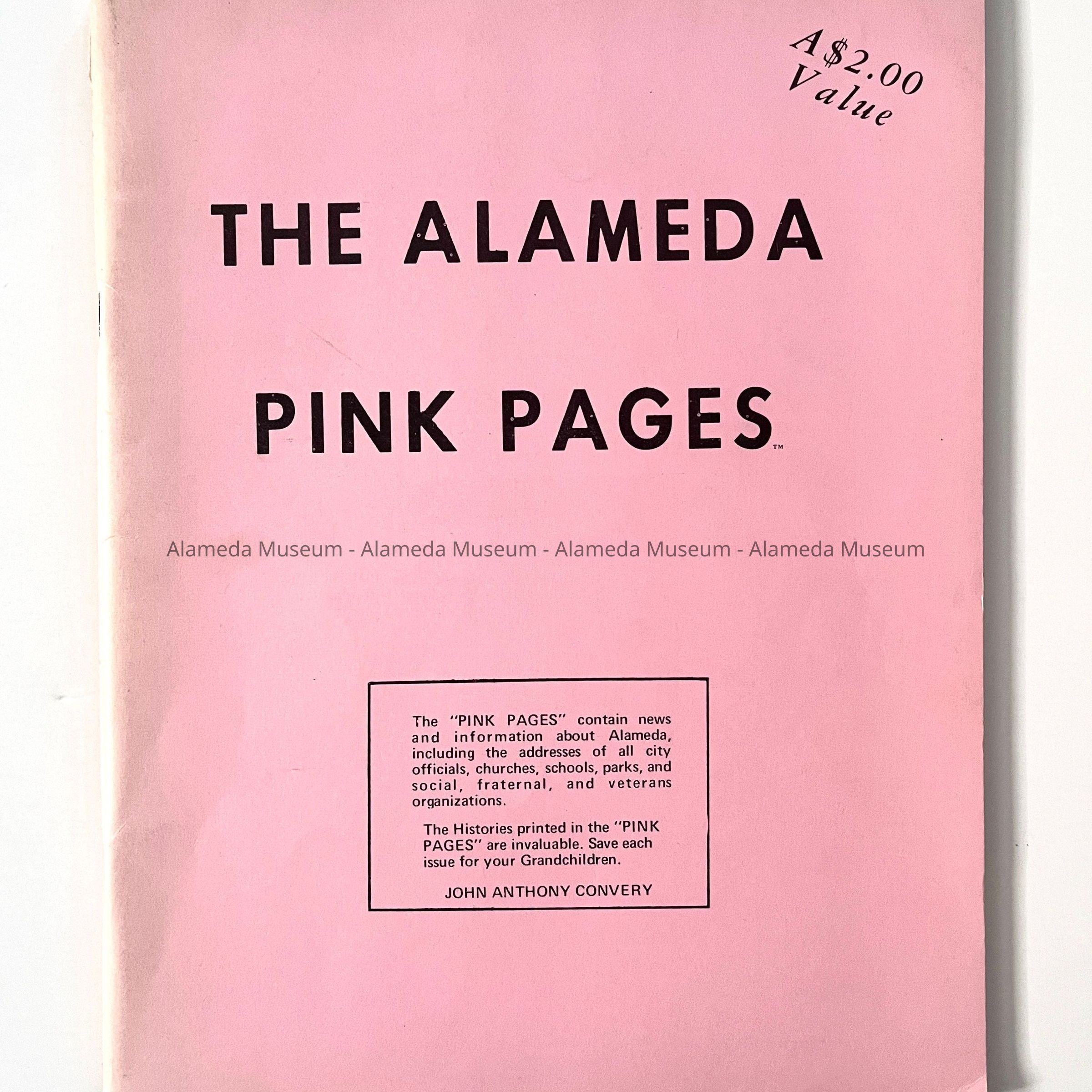 History of object: Publication titled: "Alameda Pink Pages" which includes business directories, history of the city and a street map, etc.