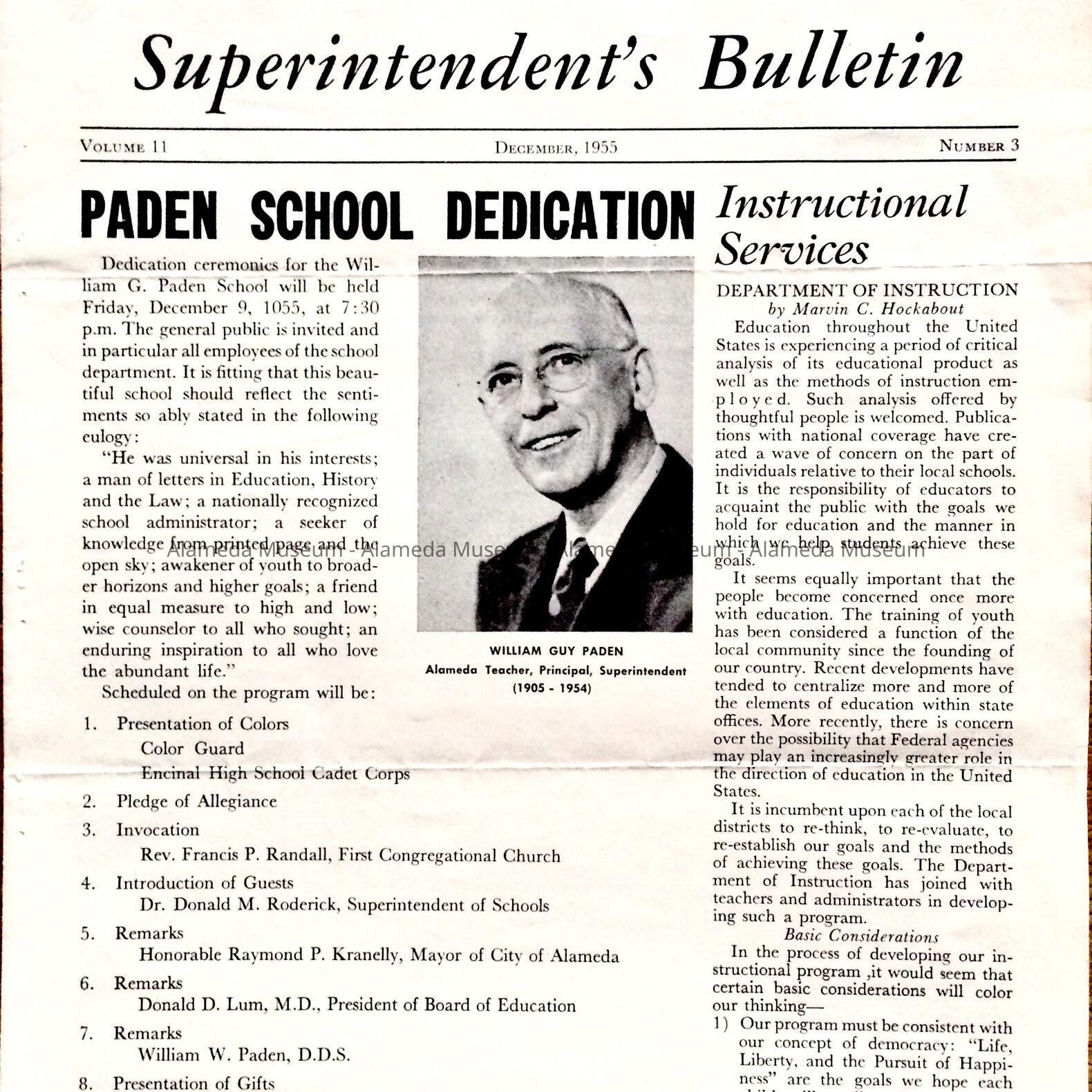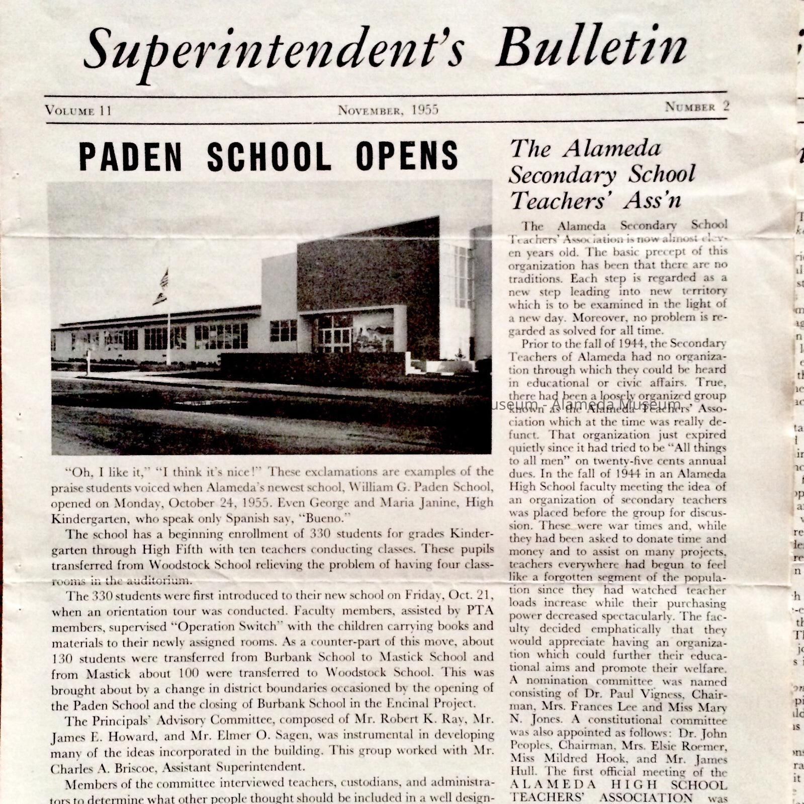 Superintendents Bulletins for June, November and December of 1955. B & C have articles concerning the opening of the new Paden School on Central Avenue.