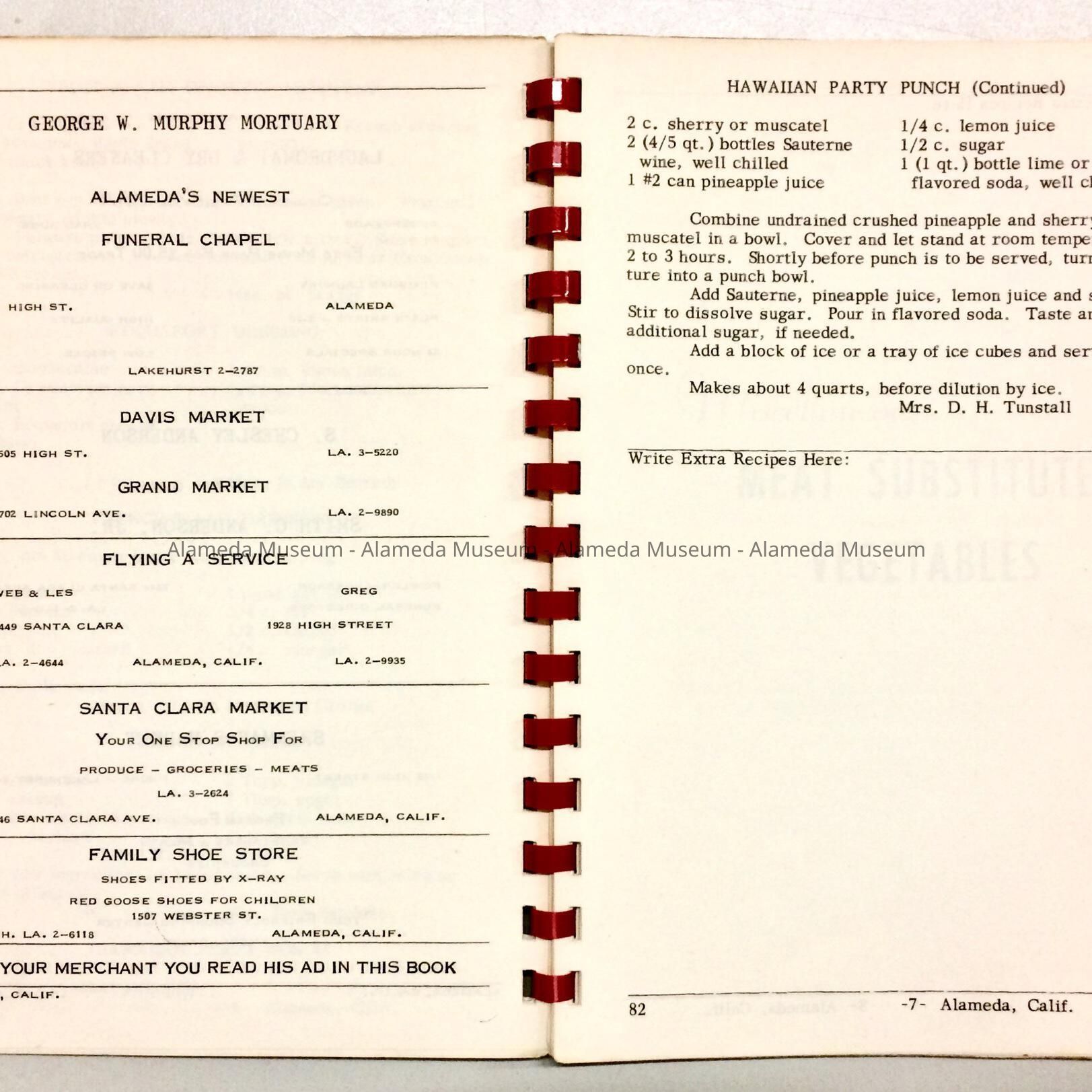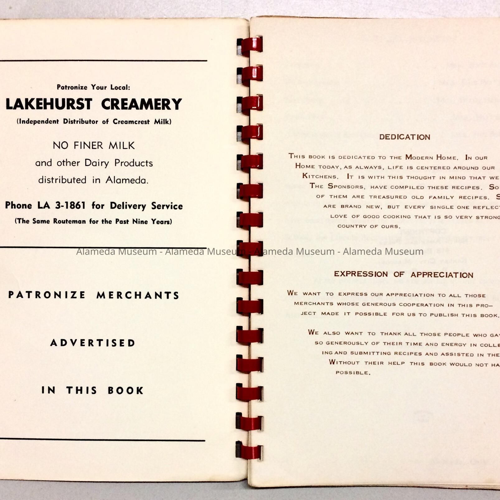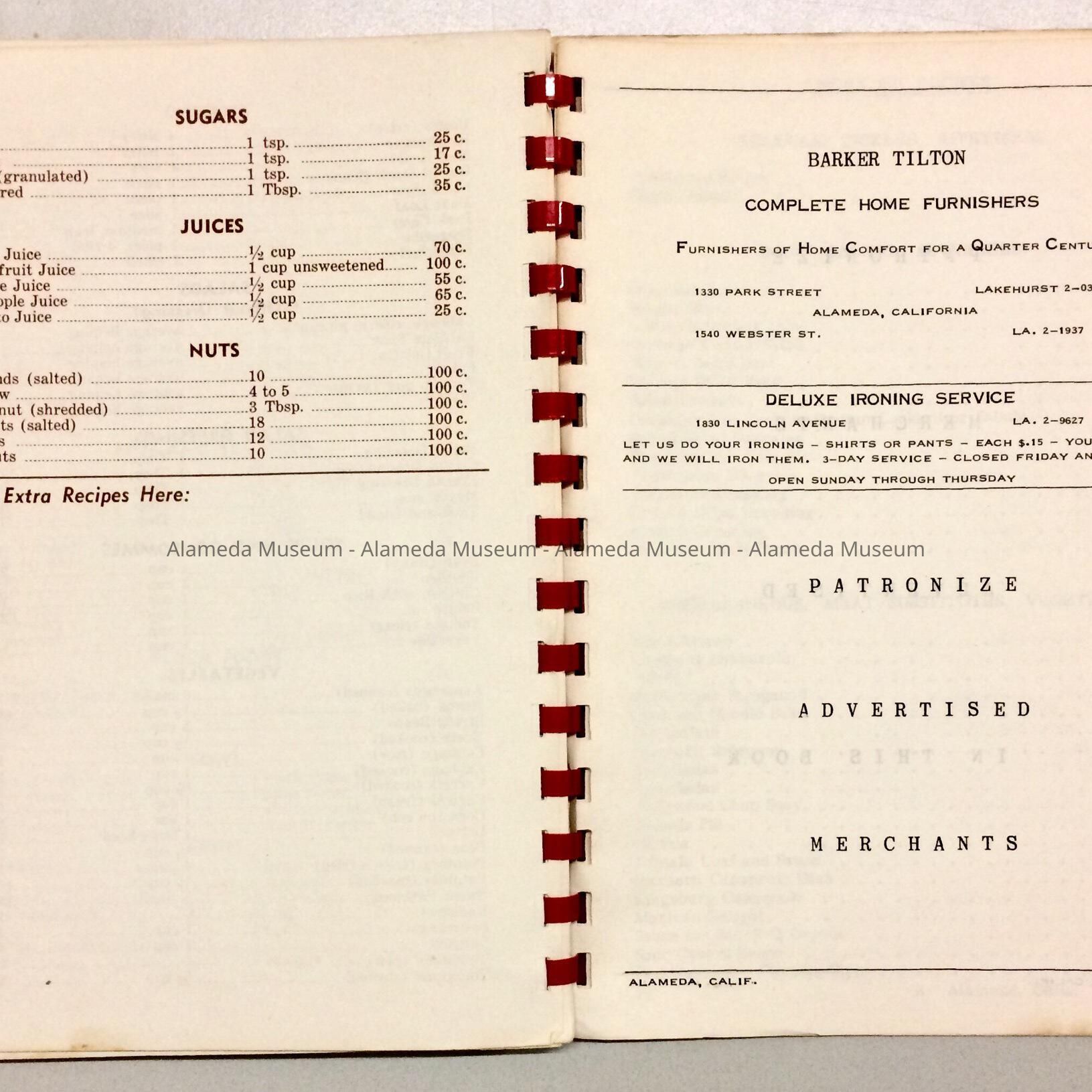 History: Recipe book published by the Alameda Junior Chamber of Commerce Auxiliary containing recipes submitted by various residents of the community. The book also contains ads of local merchants.