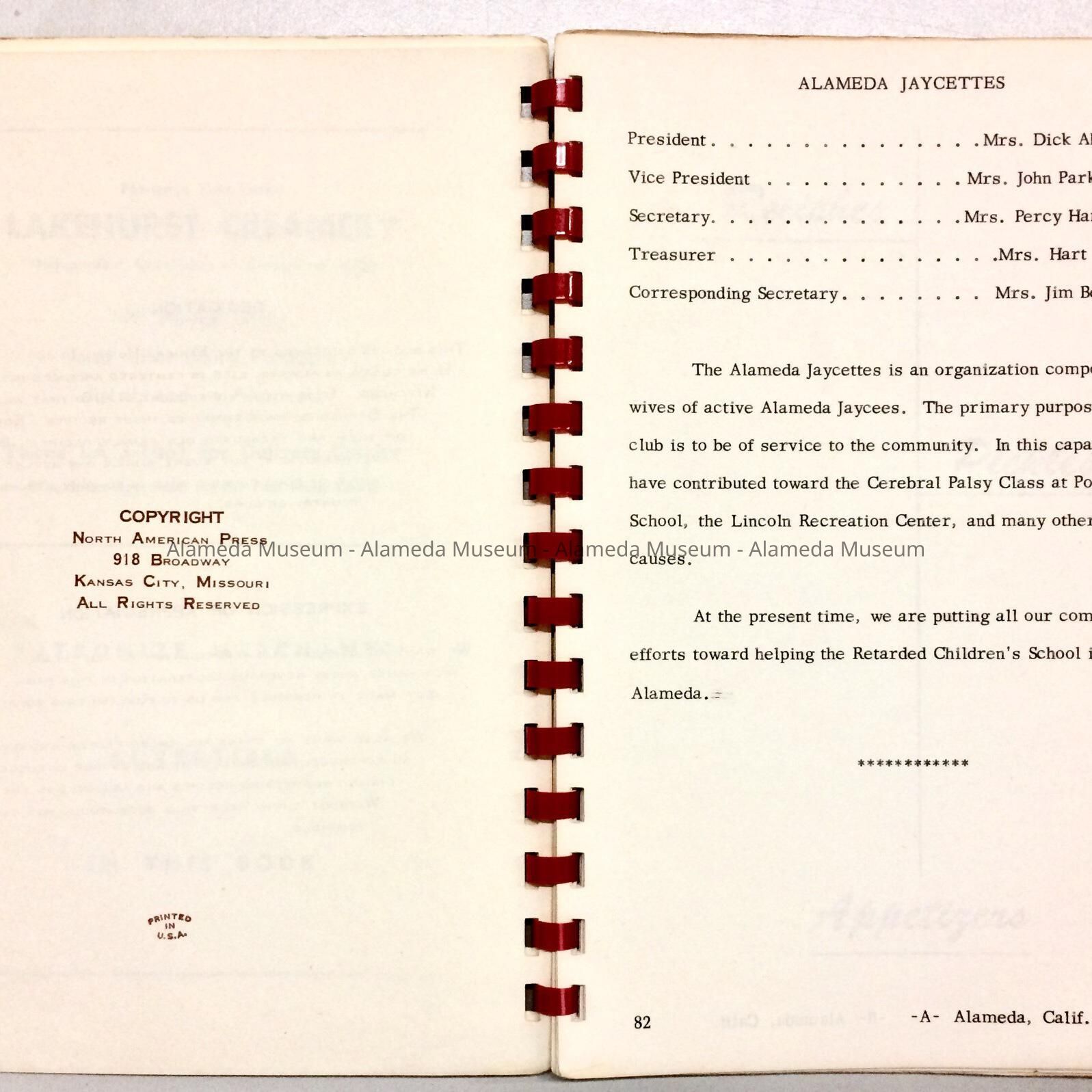 Alameda Recipe book published by Junior Chamber of Commerce Auxiliary, prior to 1970Entry/Object ID
