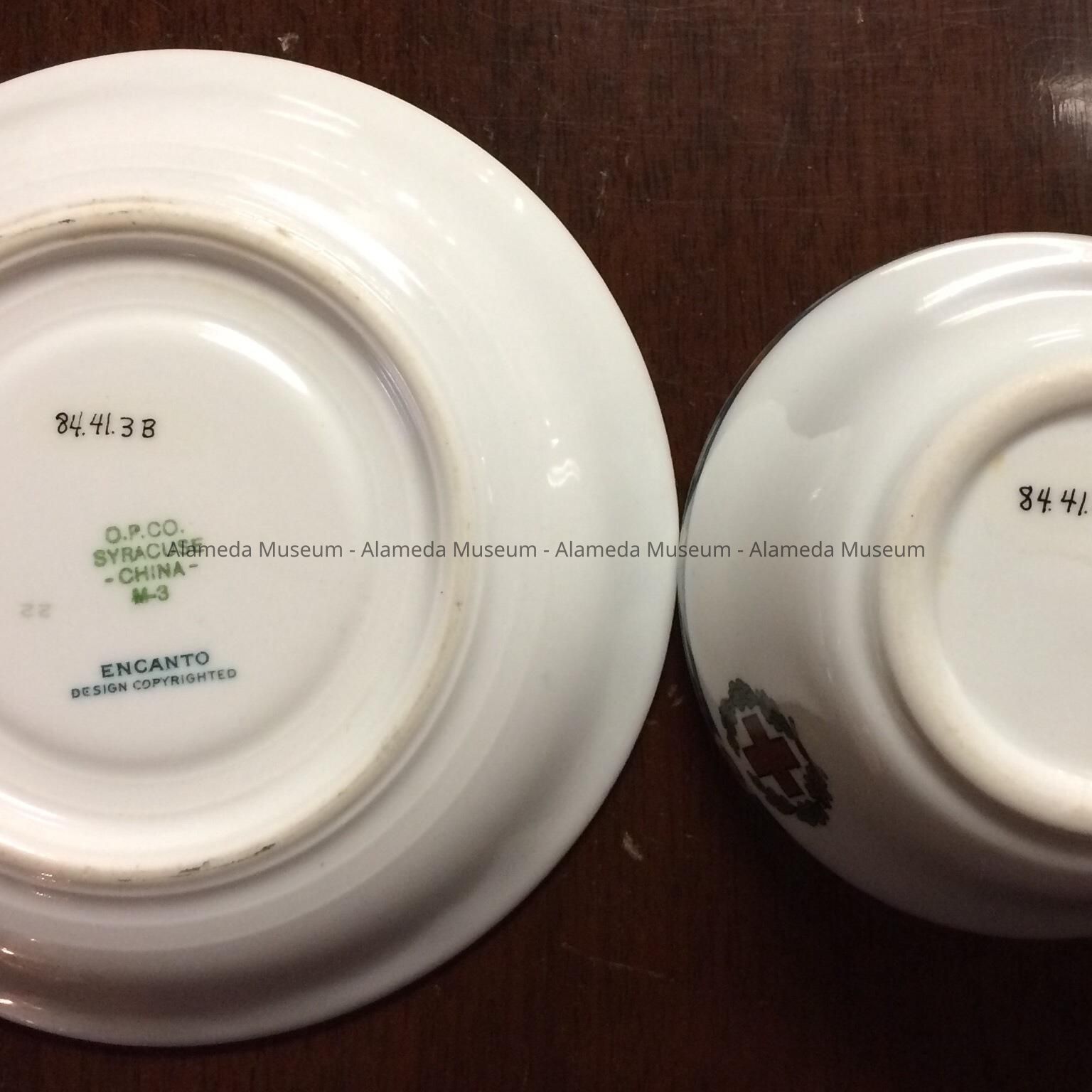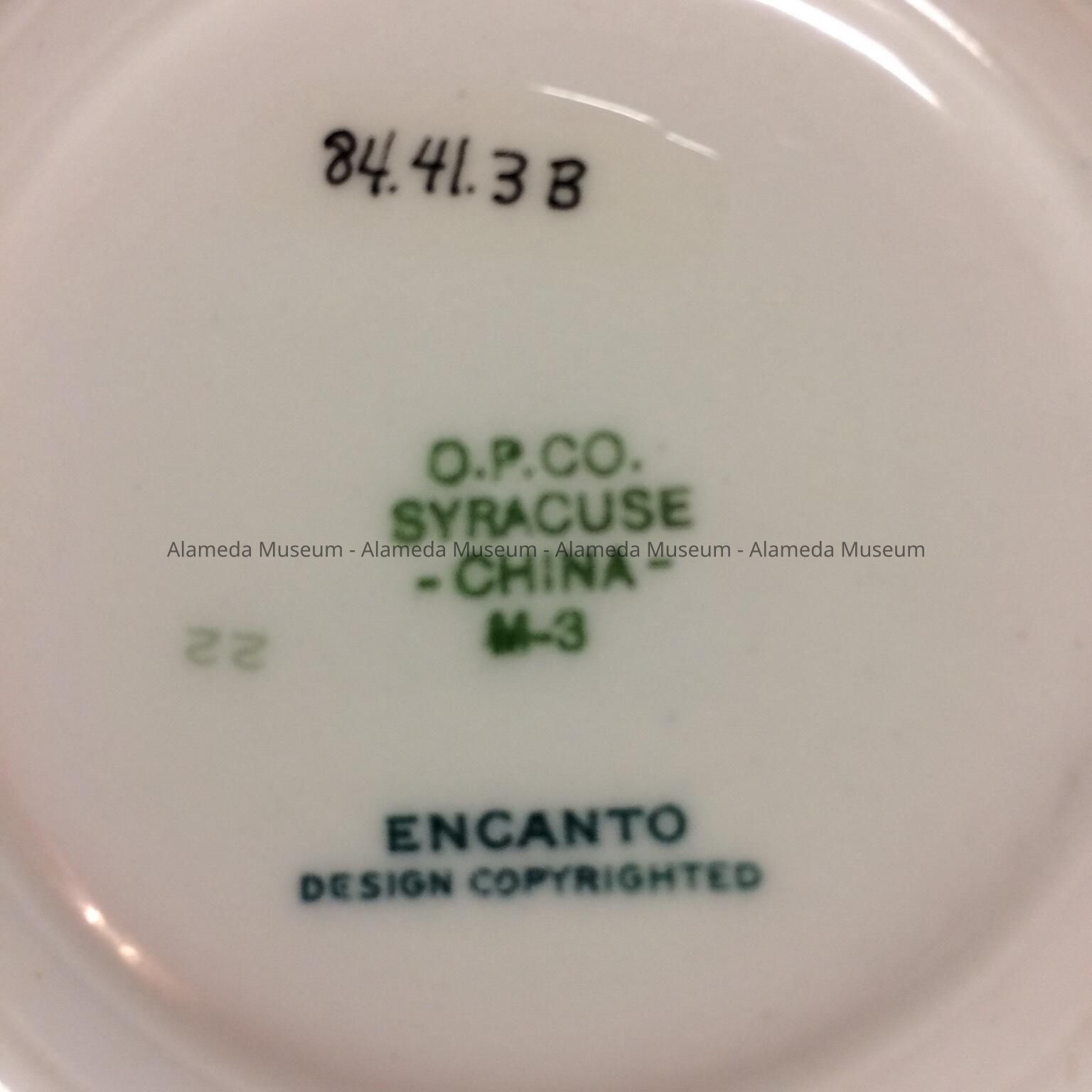 b. Saucer with matching design and emblem. On the reverse side the manufacturer’s signature "O.P.Co., Syracuse China, M-6" and pattern name "Encanto", design copyrighted is stated.