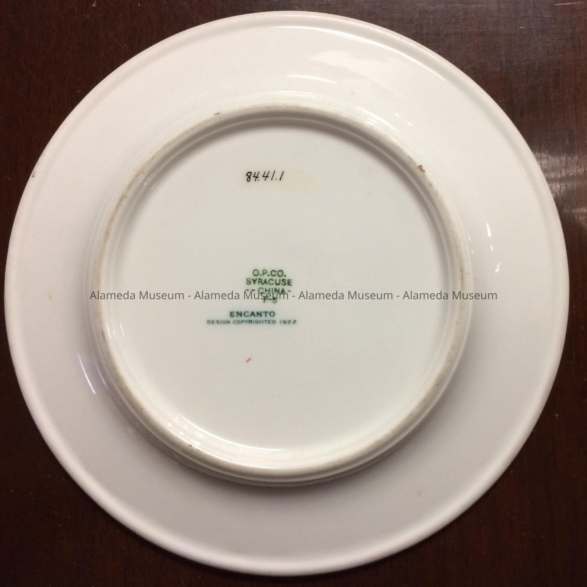 Description: Semi-Porcelain plate (salad size), white with stylized border (transfer) of red, green, yellow and white flowers & leaves on a blue background. The emblem (transfer) of the Alameda Sanatorium (later Hospital), consisting of a red cross encircled by green oak leaves is also included as part of the plate’s decorations. On the reverse side the manufacturer’s signature "O.P.Co., Syracuse China, F-5", and pattern name "Encanto", design copyrighted 1922.