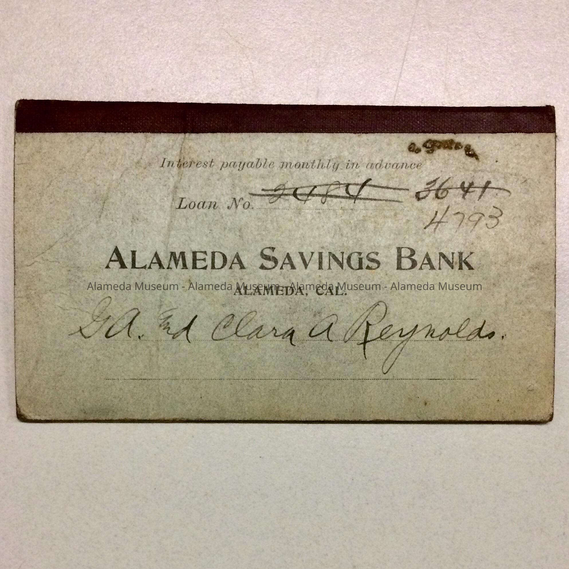 A BANK BOOK, WITH COVER OF CARDBOARD. COVER HAS A PRINTED CAPTION: "ALAMEDA SAVINGS BANK," IN BLACK-COLORED TYPE. INTERIOR HAS HANDWRITTEN ENTRIES.