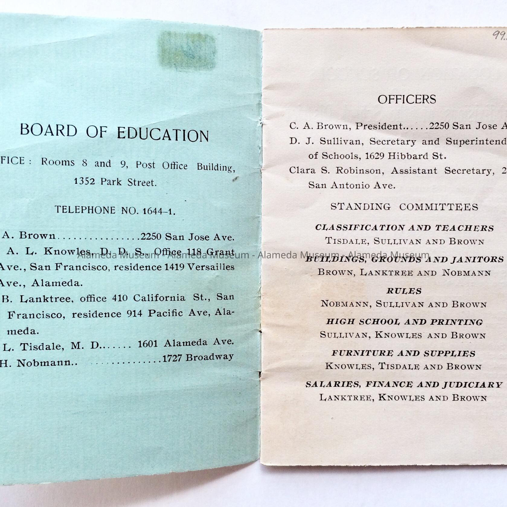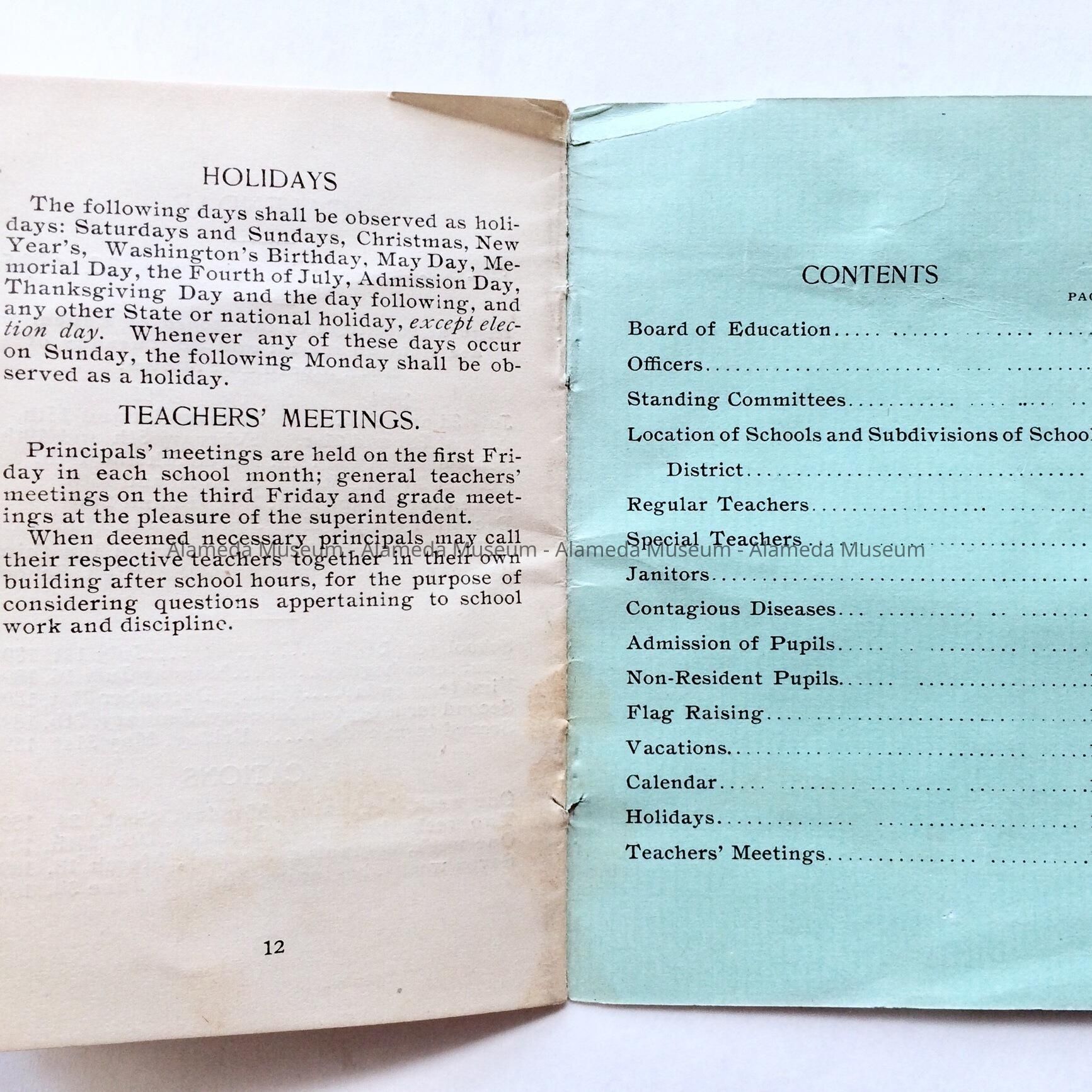 History: School directory and calendar for 1894-95, Alameda Schools. Directory gives locations of various school sites including names of teachers and staff with their addresses. Given in 1955 #307 and never catalogued.