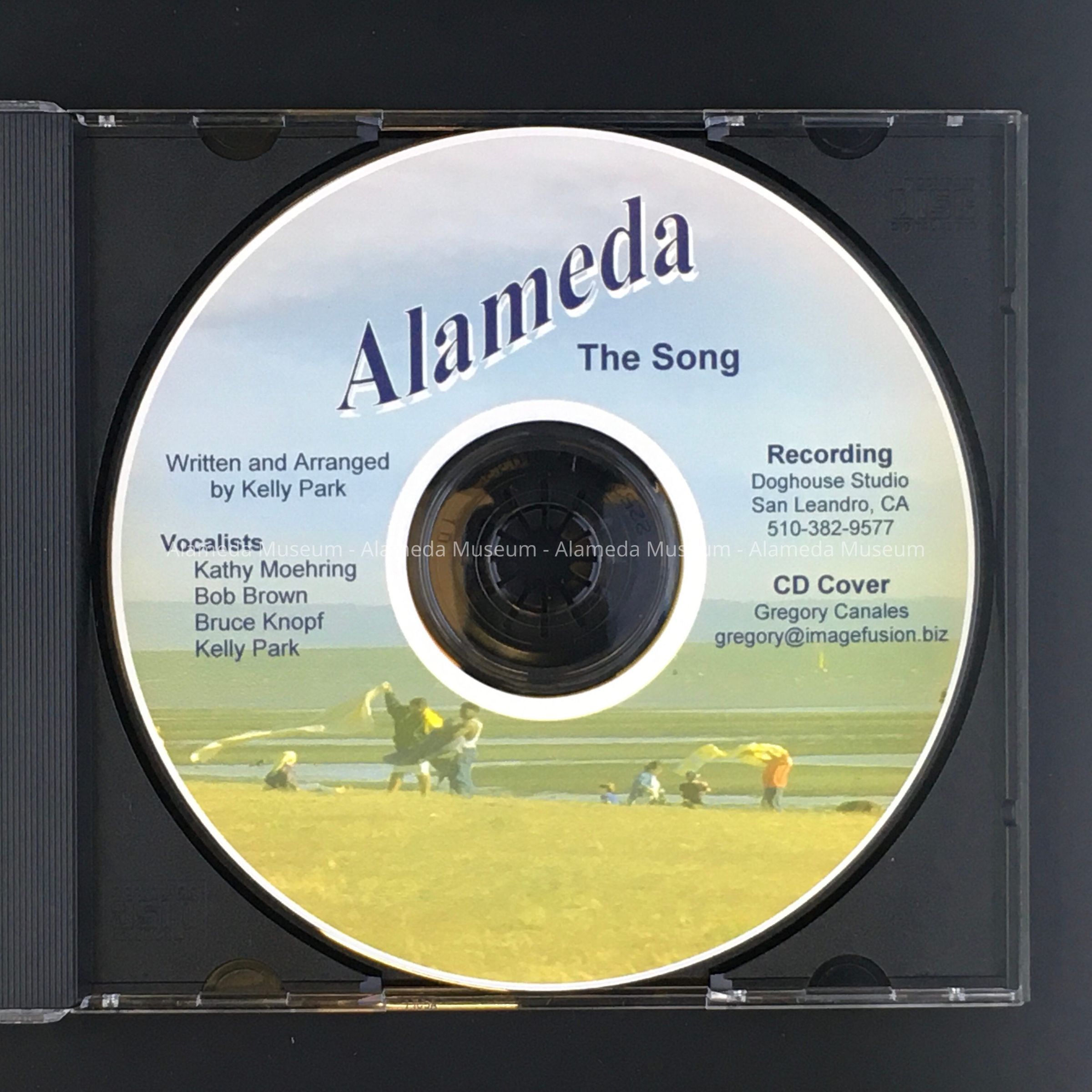 History of Object: CD with recording of a song, sung a cappella, about Alameda, written and arranged by Kelly Park, additional vocalists Kathy Moehring, Bob Brown, Bruce Knopf. Kelly Park was owner of Jazz Club Kelly's, 1313 Park Street (closed 2007, currently Hobnob (2023)), Bob Brown was City of Alameda economic development, and redevelopment manager (1990-2006), and he and his wife Kathy Moehring, currently Executive Director West Alameda Business Association, and a regular performer with Kelly Park, including at Rhythmix Cultural Works, are supporters of various Alameda organizations. The image may not be from Alameda, and the recording was not done here.