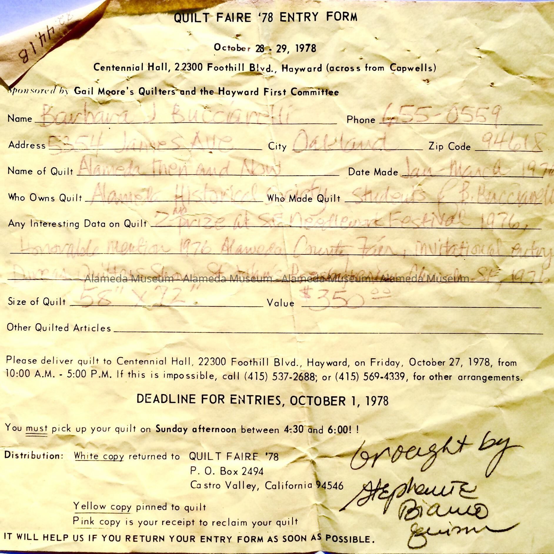 History of Object: Entry form "Quilt Faire-1978" Centennial Hall, 22300 Foothill Blvd, Hayward, for the quilt (82.44.1 A) entitled "Alameda Then and Now. Created by students of Barbara Bucciarelli at Alameda Adult Education School, winter quarter, 1976. Made for the Alameda Celebration of the American Bicentennial, 1776-1976.