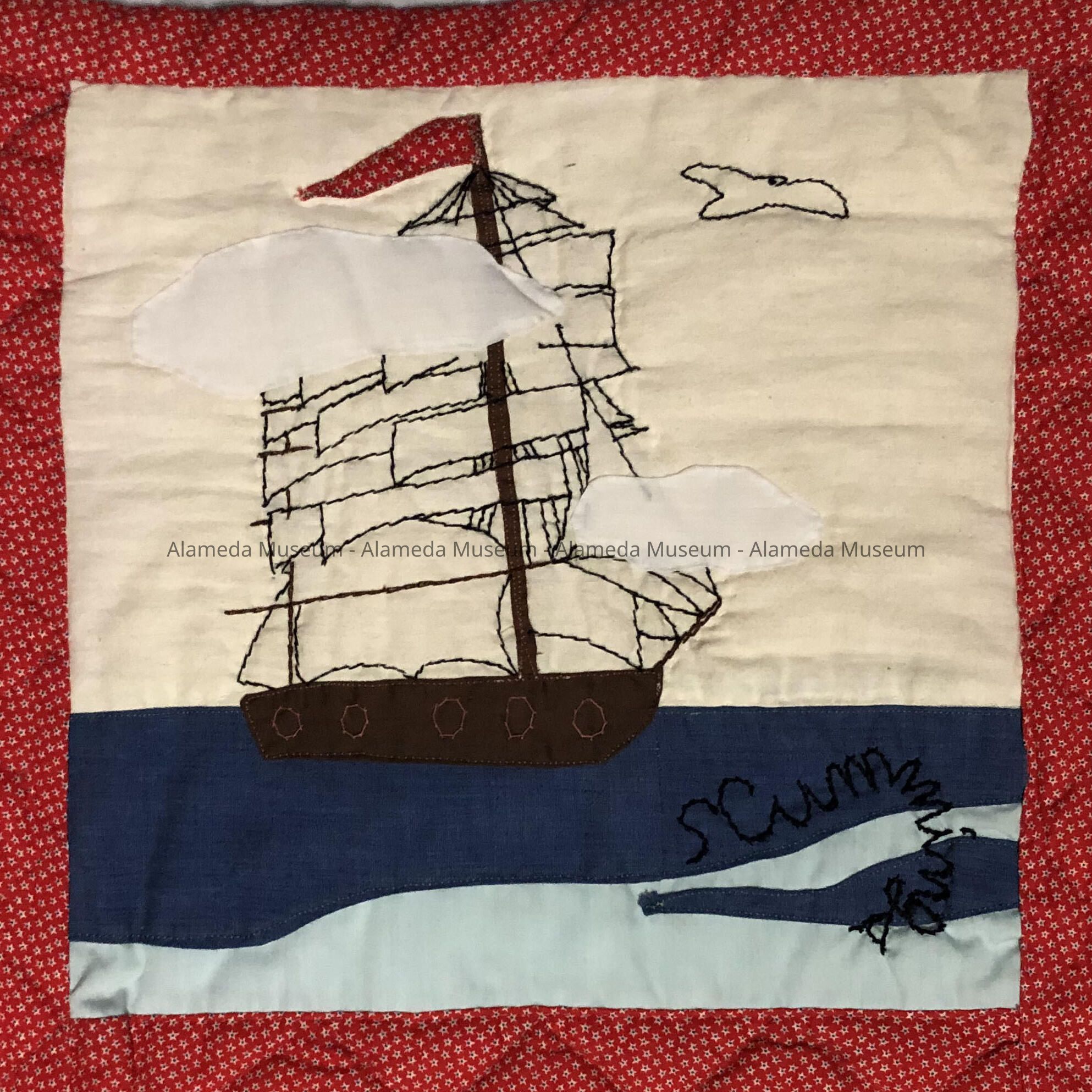 History of Object: Quilt entitled "Alameda Then and Now" was made by the students of Barbara Bucciarelli at Alameda Adult Education School, Winter Quarter, 1976, for the Alameda Celebration of the American Bicentennial, 1776-1976.