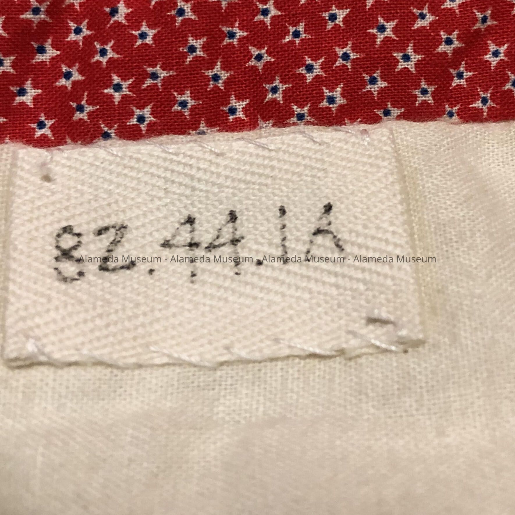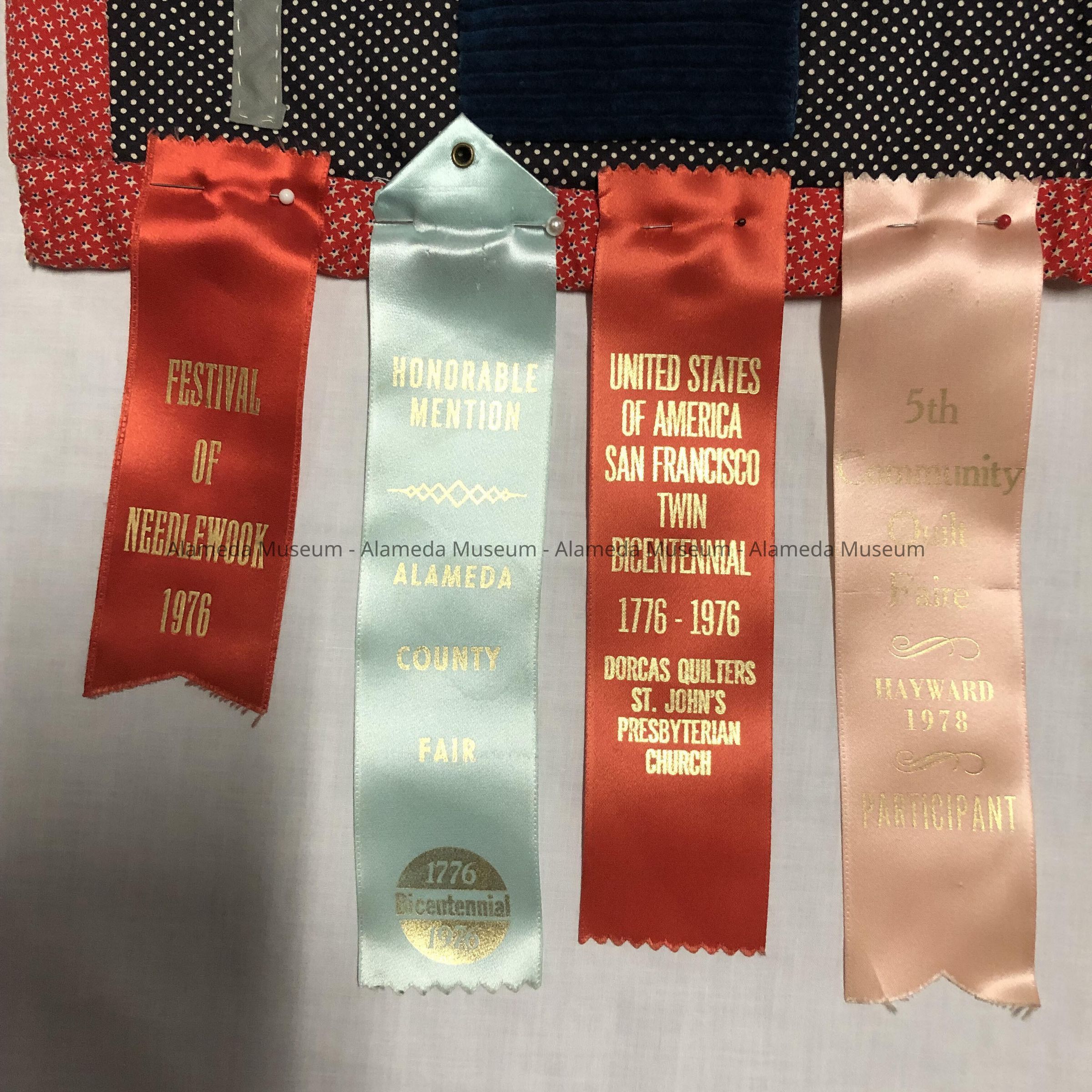 Attached to the bottom of the quilt are (3) silk ribbons: far left-gold print on pink silk states "5th Community Quilt Faire, Hayward, 1978, Participant." Size, 2x9 inches. middle-gold print on blue silk states "Honorable Mention, Alameda County Fair, 1776-1976-Bicentennial." Size, 9¼x2 inches. right-gold print on red silk states "United States of America, San Francisco Twin Bicentennial, 1776-1976, Dorcas Quilters. St. John's Presbyterian Church, Size, 8¼ x2 inches. far right-gold print on red silk states "Festival of Needlework, 1976"